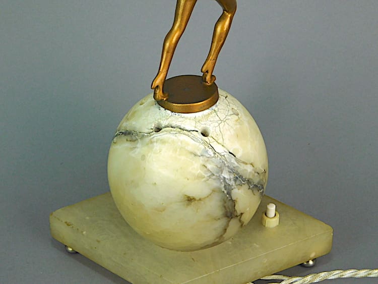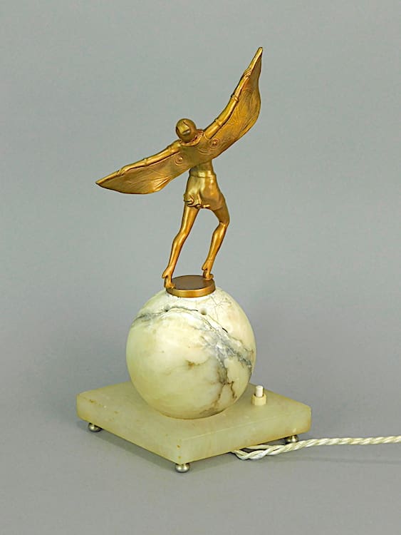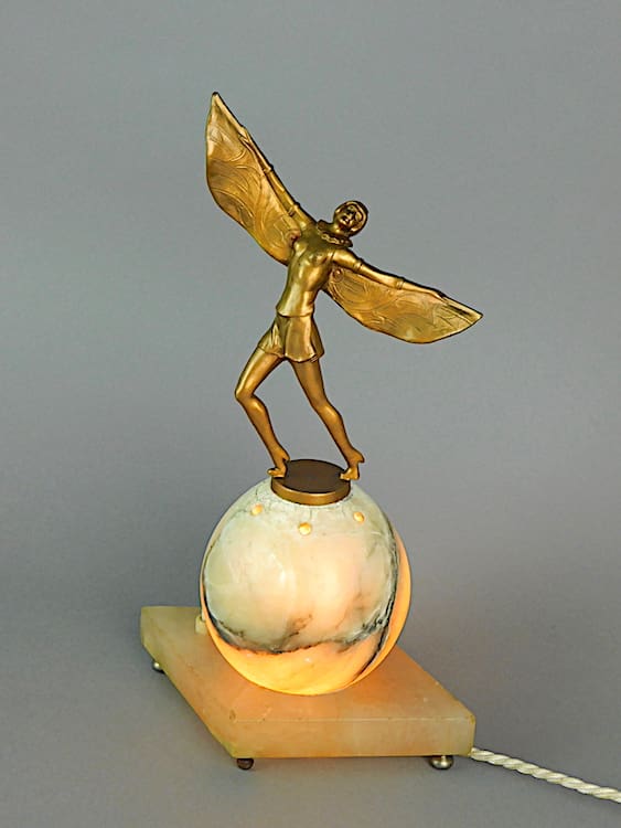 A cute metal theatrical lady wearing a winged costume and standing on top of a 4 inch alabaster globe shade on a cream onyx base.
