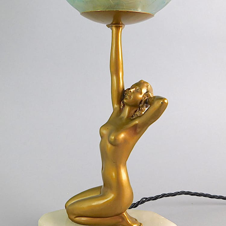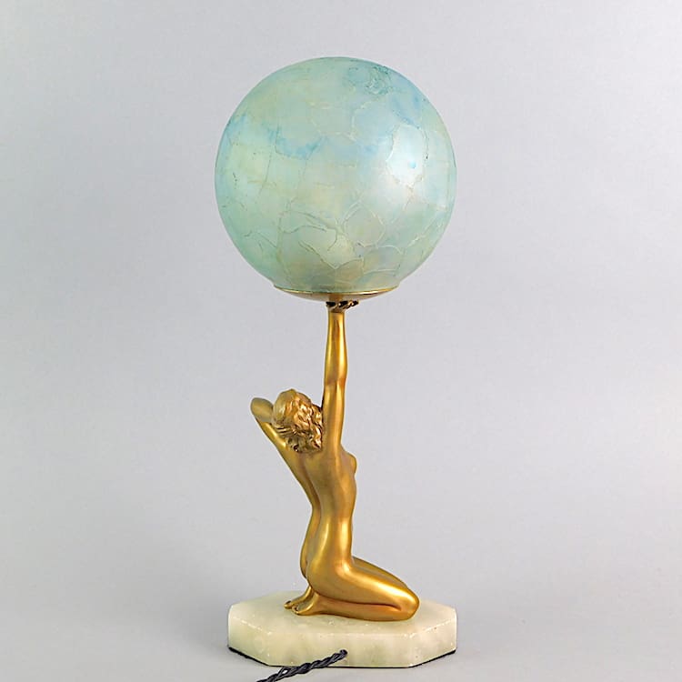 Austrian spelter kneeling lady lamp, an unsigned Lorenzl. Gilt patina with blue tinted glass globe.
