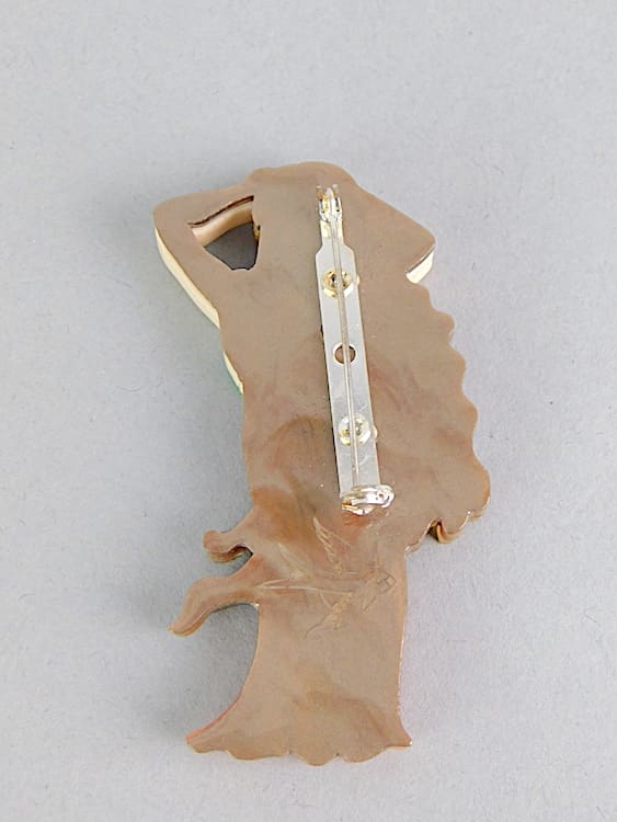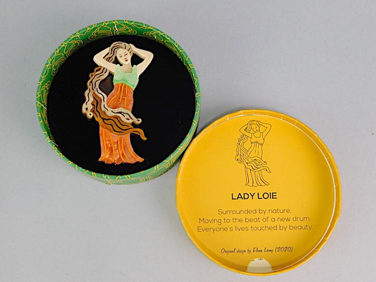 Phenolic art nouveau lady brooch by Erstwilder. Fitted with a roll safety clasp. Comes in its original box with nouveau tag and stamped with the Erstwilder bluebird to the reverse.