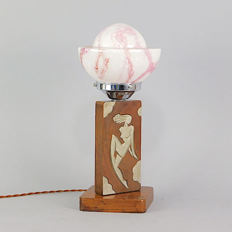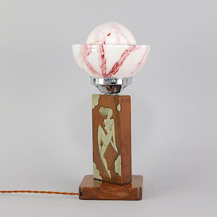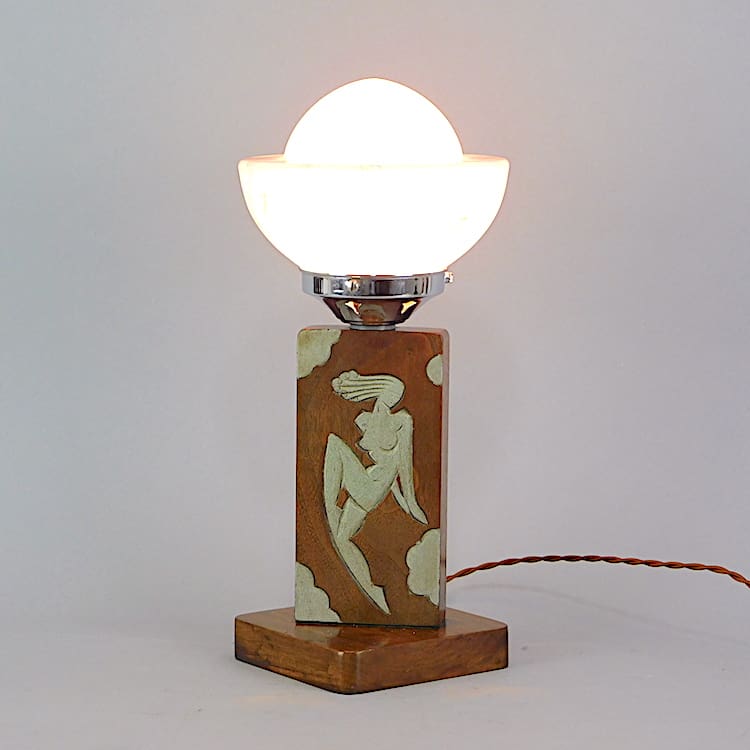 Modernist hand carved wooden table lamp with unusual glass spaceship shade. Fitted with an in line on/off switch.