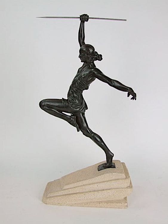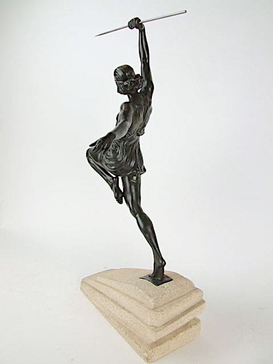 This is the larger art metal Amazone aux Javelot, by Pierre Le Faguays, made by the Le Verrier foundry during the 1930’s. The base socle bears the Le Verrier foundry stamp and NAG which is often the marking for this larger version of this statue.