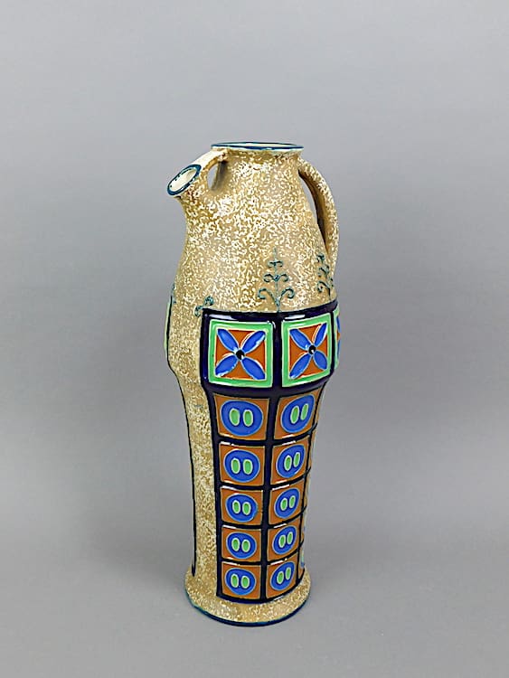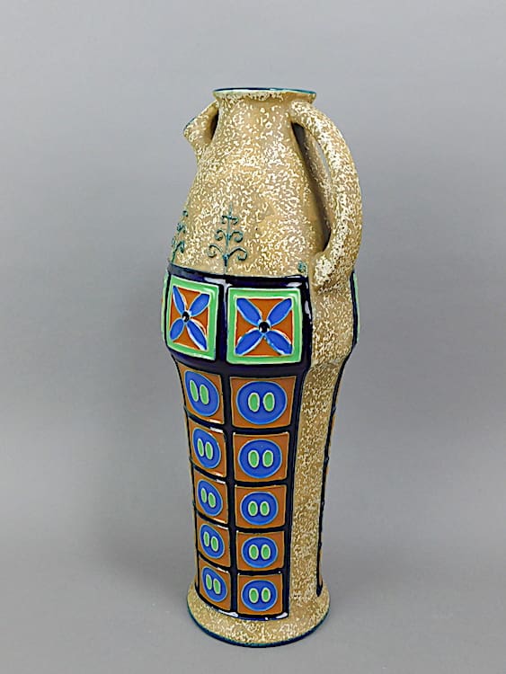 A brightly decorated Austrian ceramic vase. Signed Amphora to the base and also still bearing its original retailers sticker from Lille, France.
