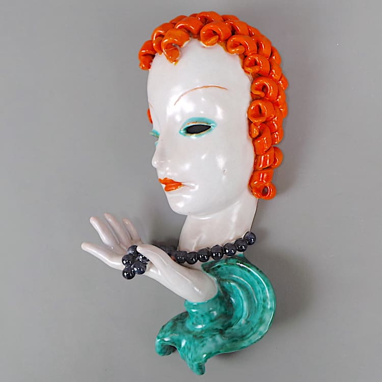 Large hand painted terracotta art deco wall mask – designed by Rudolf Knoerlein in 1935.