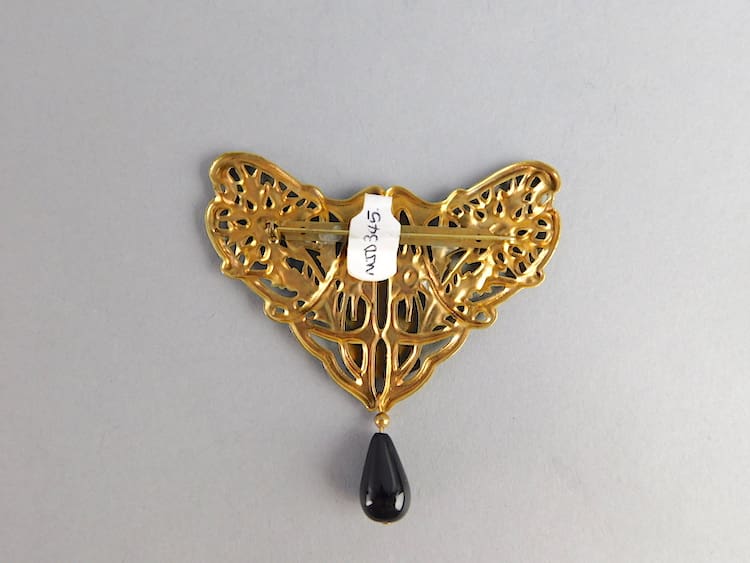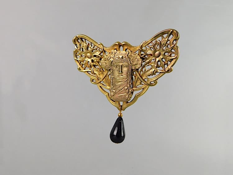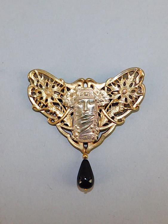 Very large contemporary Mucha style brooch with the image of a maiden surrounded by foliage.