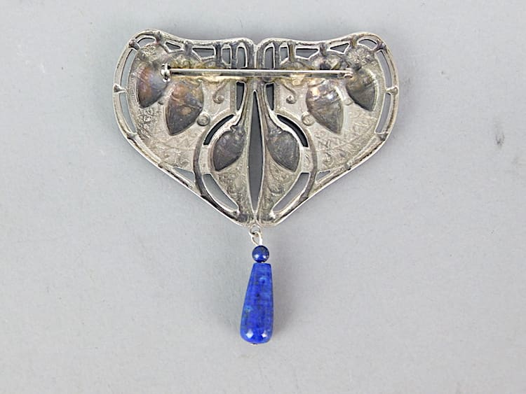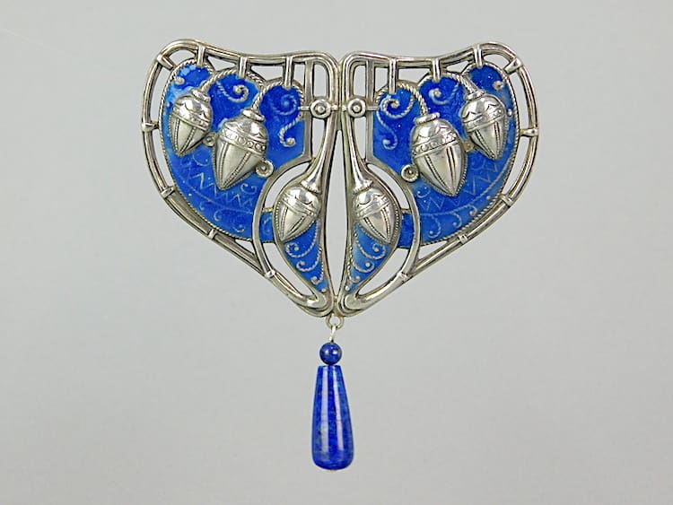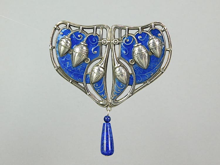 A large metal brooch with blue enamelling and blue hanging stone.