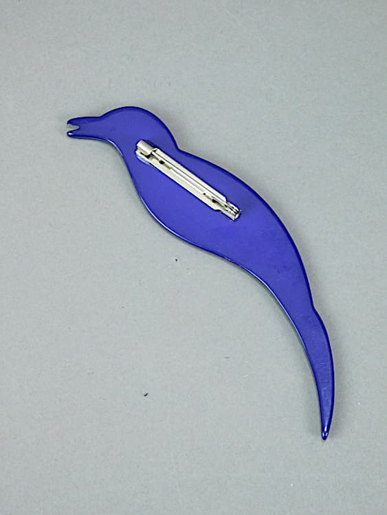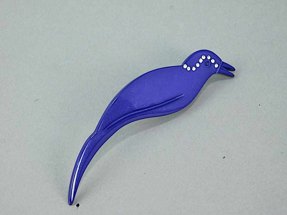 Large French 4.25 inch (10.5cm) glitzy celluloid bird brooch, unsold old shop stock from the 1960s.
