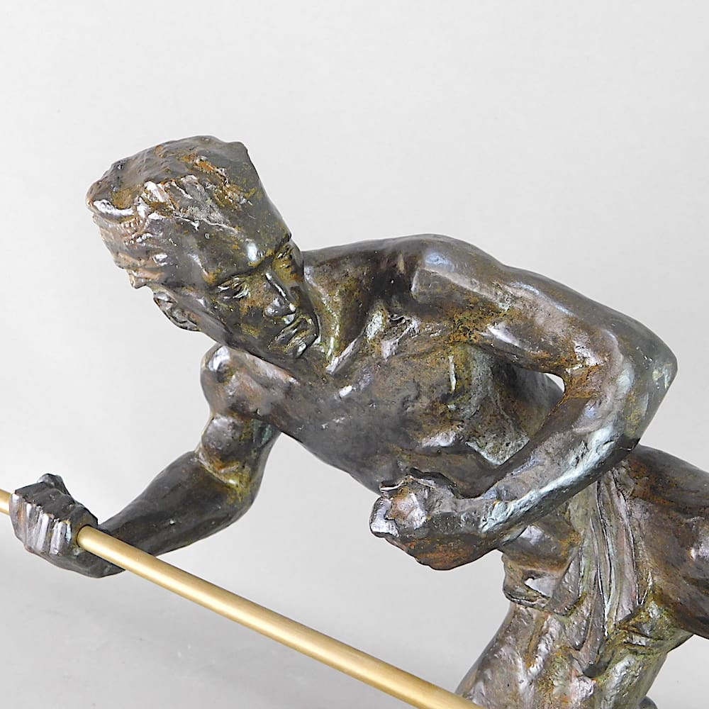 Stylised dark green patinated bronze art deco warrior on a green marble base.