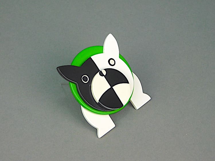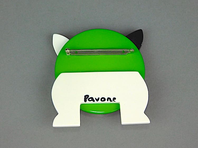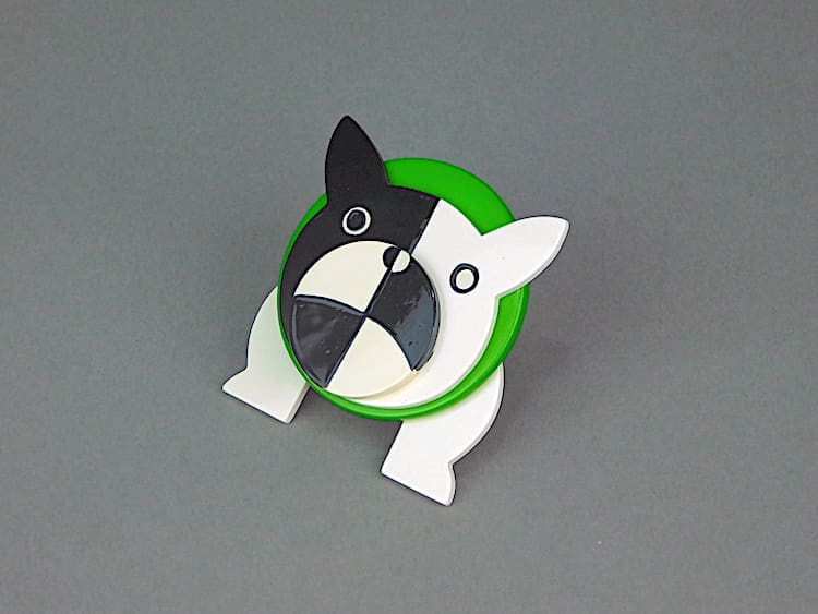 French hand painted large vintage Galalith bulldog brooch. Signed to the back Pavone (Marie-Christine) and fitted with a roll safety clasp.