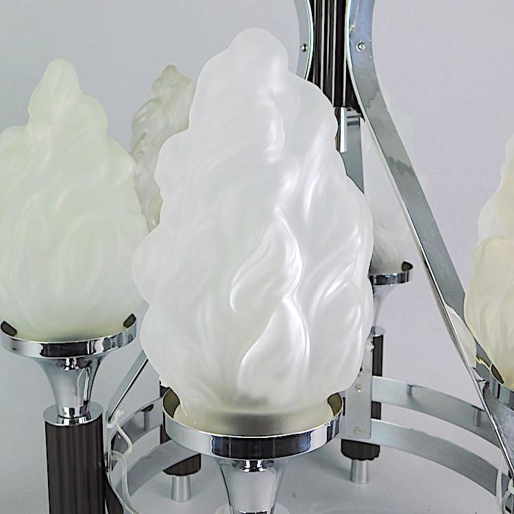 English phenolic black ribbed and chrome modernist ceiling lamp with 6 arms and torcher shades.