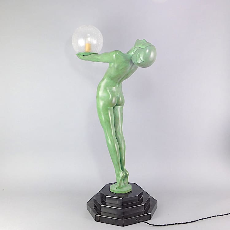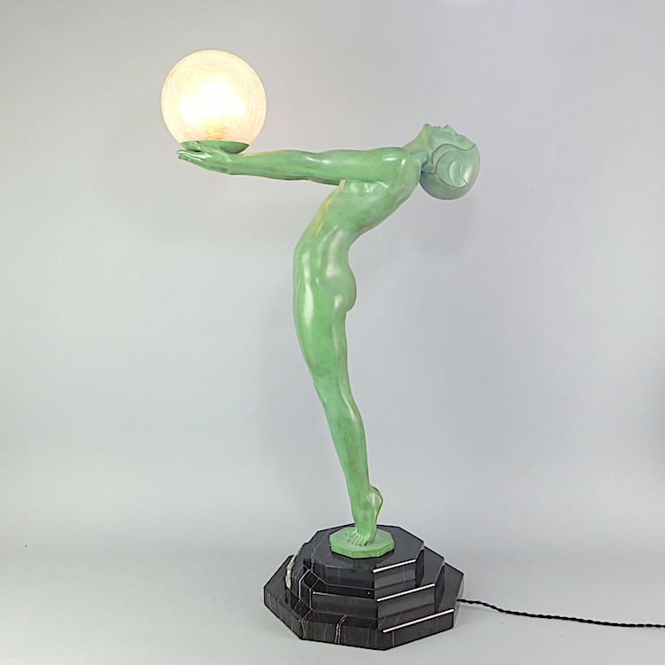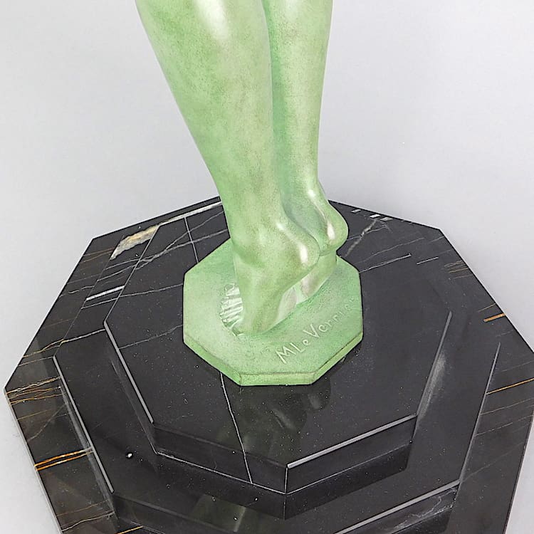 French green patinated art deco lamp signed Le Verrier to the base.
