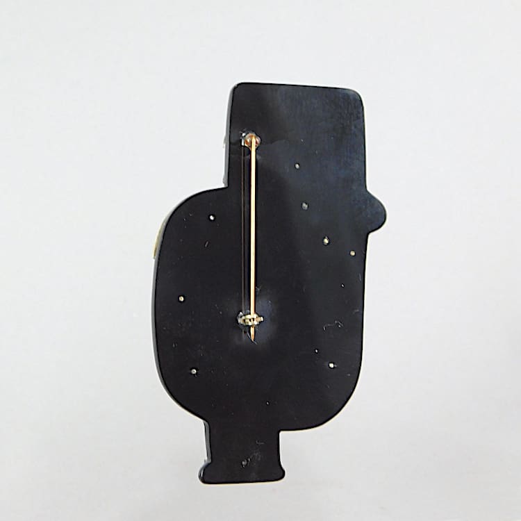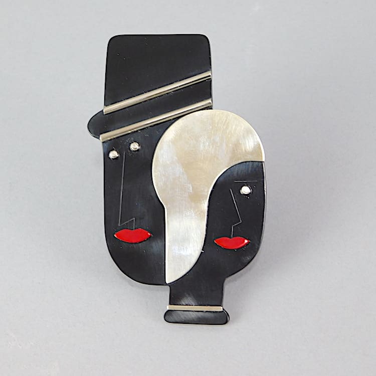 French large art deco phenolic and chrome abstract couple brooch. Fitted with a roll safety clasp.