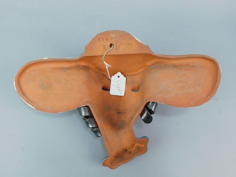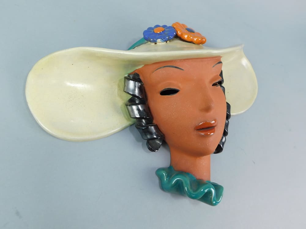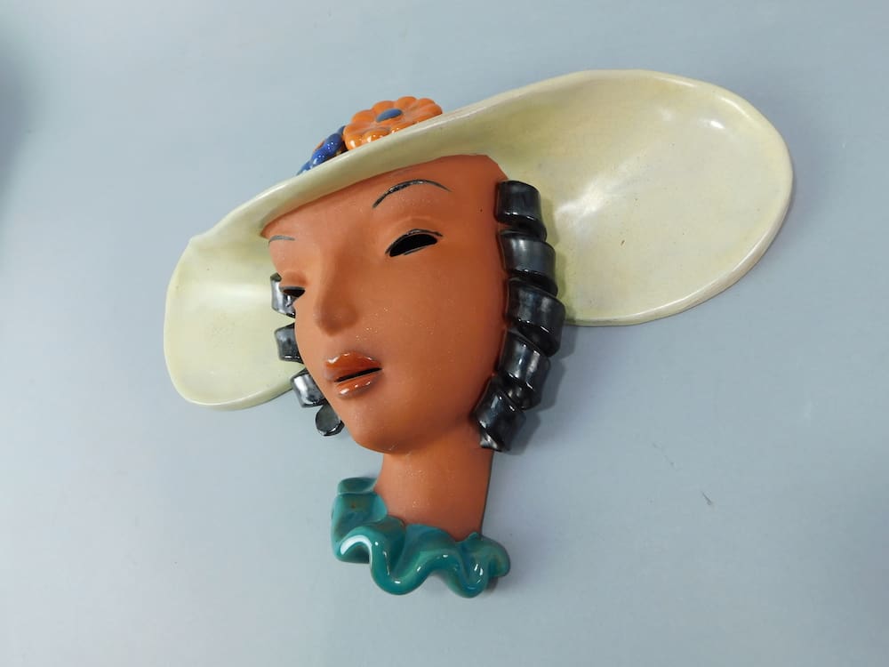 A large Czech mask with wide brim hat. Stamped to the reverse, Made in Czechoslovakia and with the serial number 1107. I believe made by Keramia, designed by Karl Grossl and beautifully hand painted with Goldscheider style curls and collar.