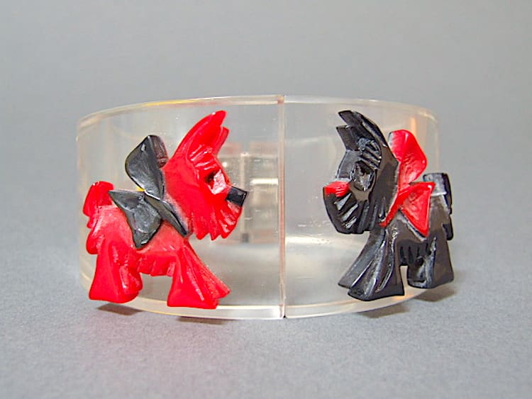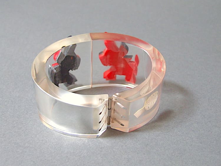 Chunky vintage French lucite and red and black galalith clamper bangle. Will fit a small to medium sized wrist.