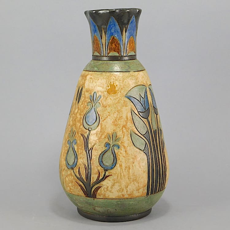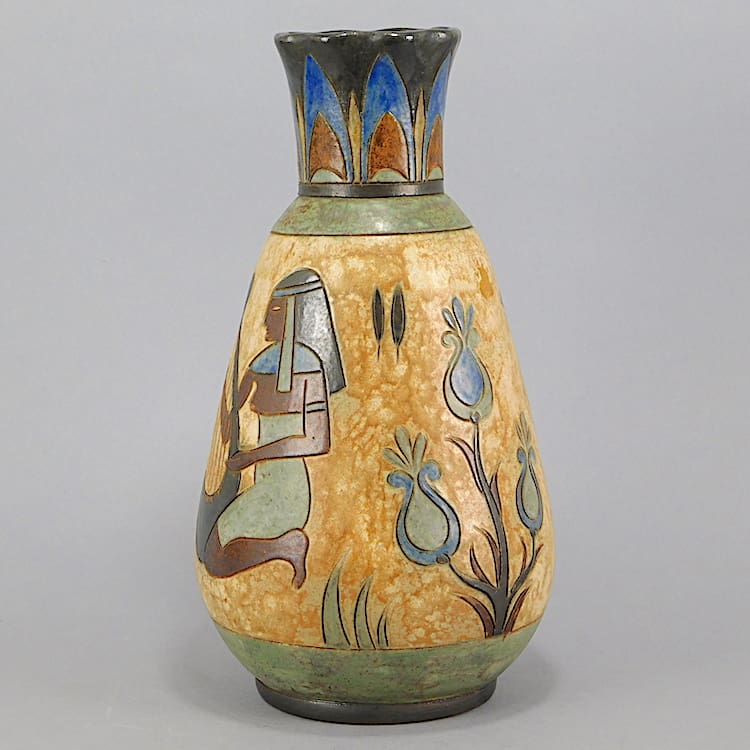 Belgian terracotta hand painted Egyptian themed vase signed Dubois (Antoine Dubois) and numbered E12B under the base.