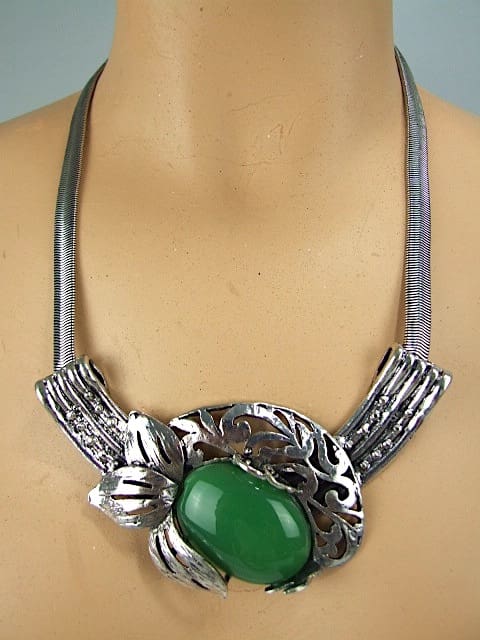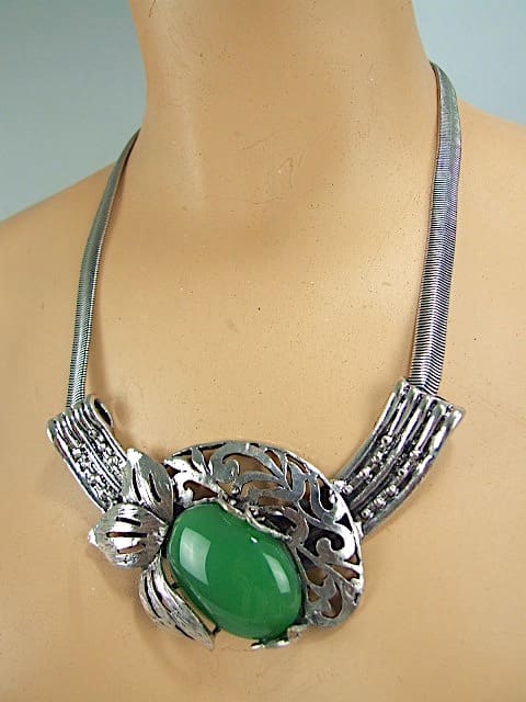 Silver metal central piece with green onyx central stone and leaf detail. Mounted on a flat snake chain.