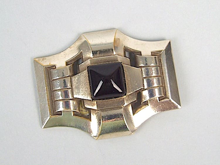 Silvered metal and black onyx stone. Fitted with a roll safety clasp.