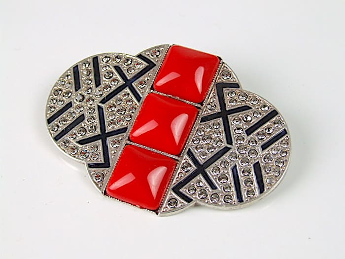 Red onyx and black enamel with diamonte detail. Fitted with roll safety clasp.