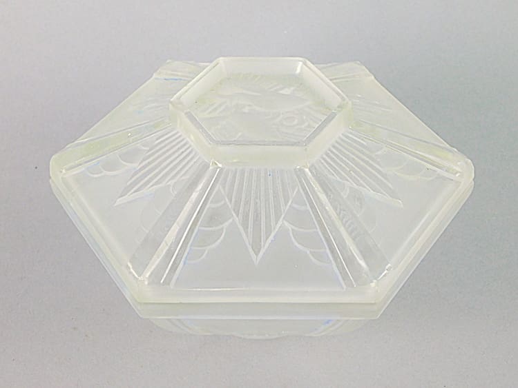 Art deco frosted glass powder bowl with stylised bird and sun ray patterning.