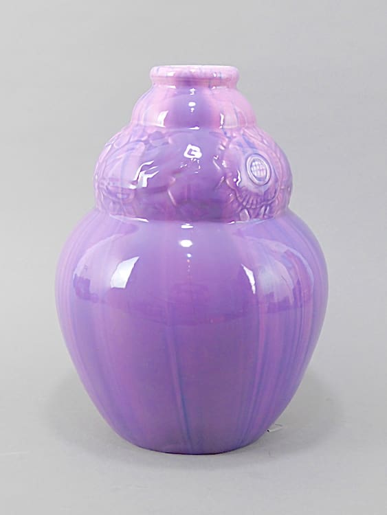 A drip glaze vase in pinks and purple with stylised floral centre section, and initialled underneath BL and numbered 349. I would guess it may be by one of the craquelier factories – possibly St. Clement.