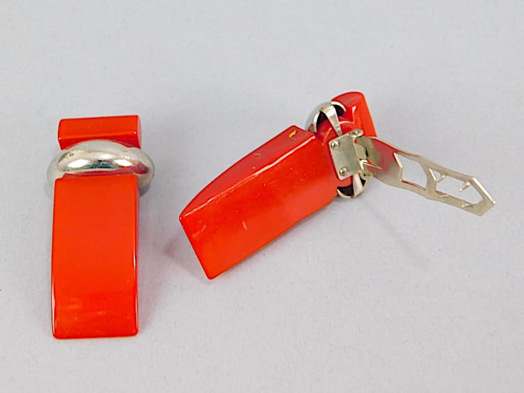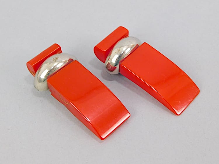 Lovely red galalith and chrome dress clips made in the USA in the 1930’s. They are marked on the clip made USA.
