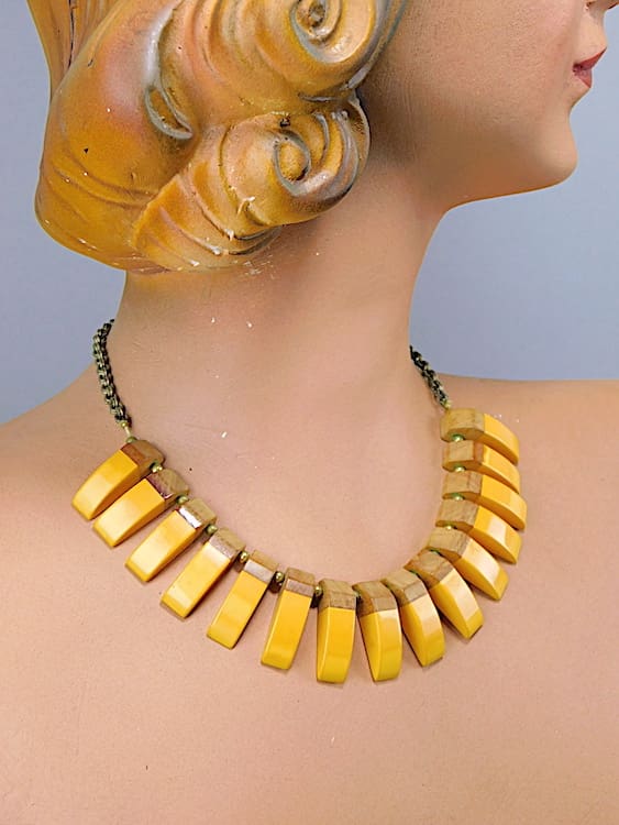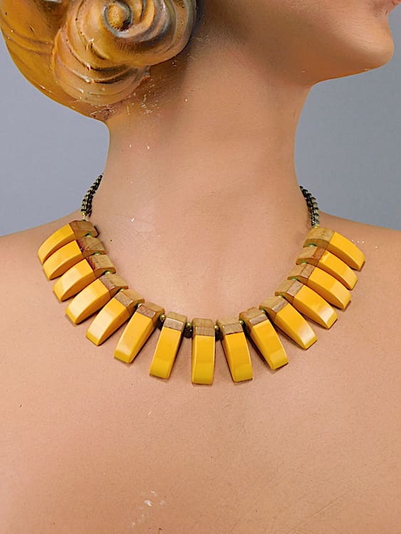 Tribal Josephine Baker style necklace with large fringe section made from yellow celluloid and wood. The end clasp is marked w Germany.