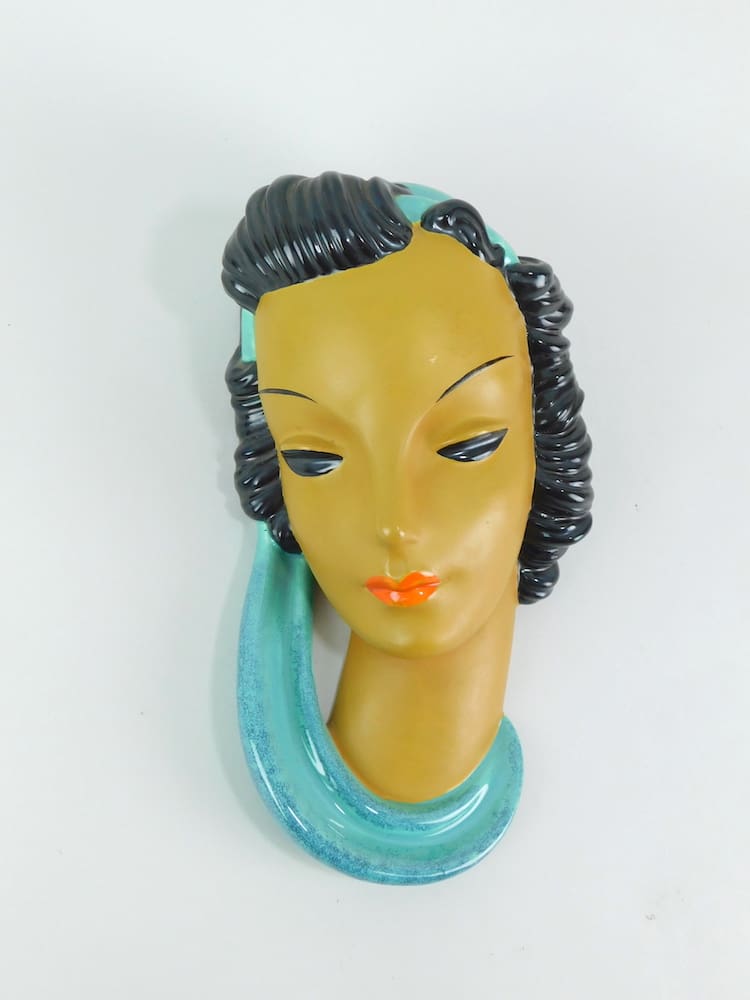 This stunning wall mask dates from the 1930s and was hand made and painted – unlike the later models. She was designed in 1937 by Adolf Prischl. The reverse is glazed and stamped Goldscheider Wien and numbered 8041 + 11 + 84.