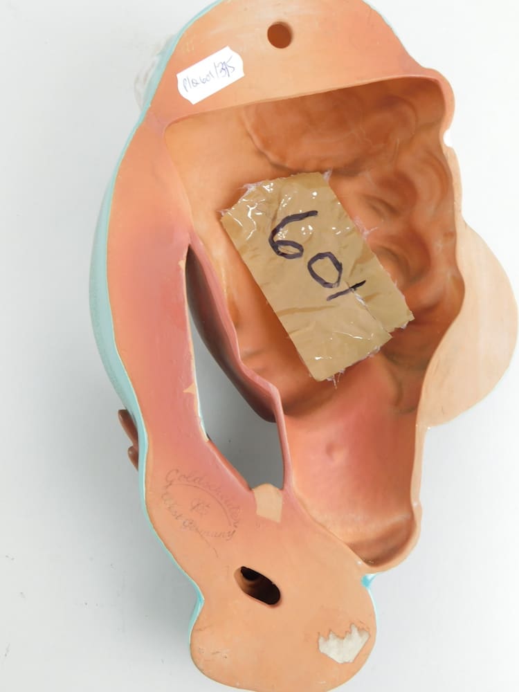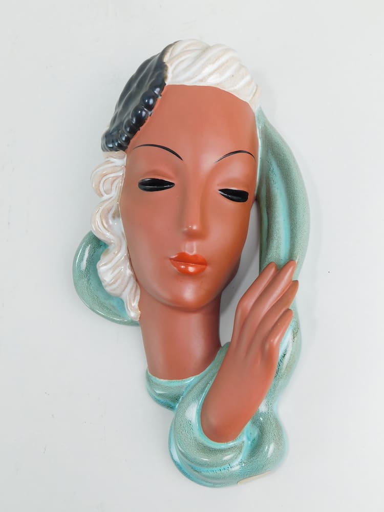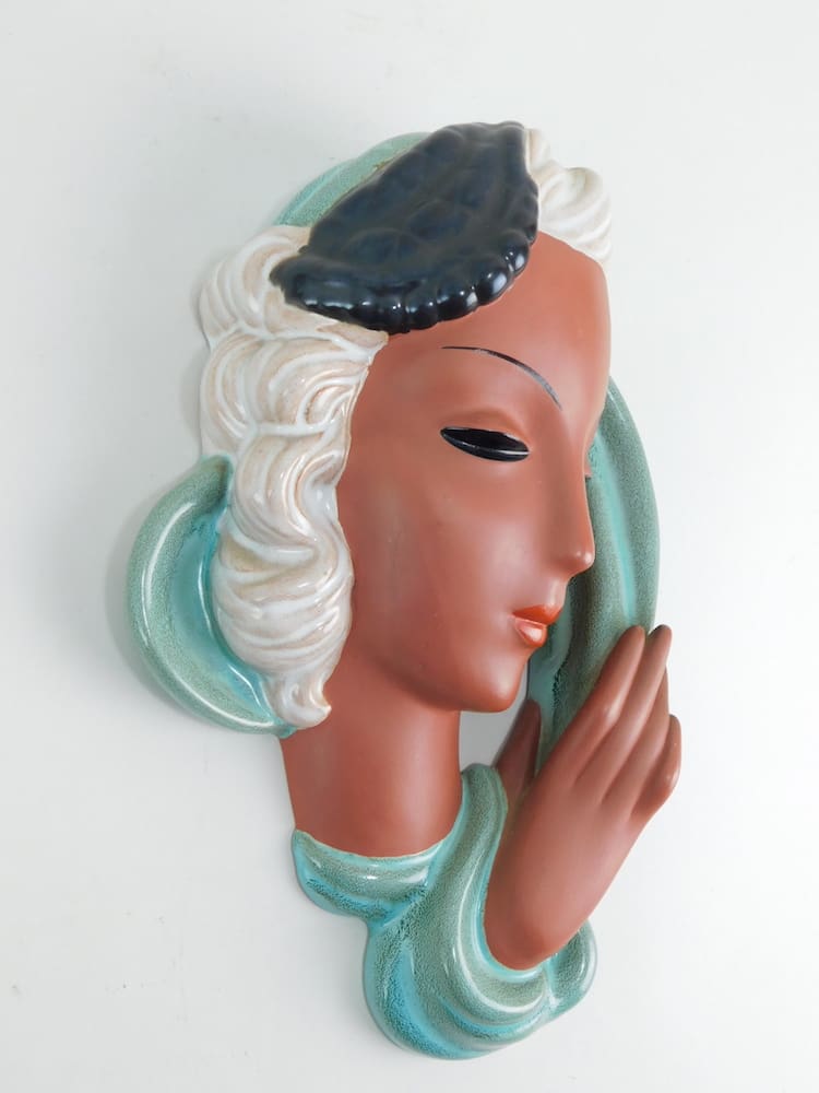 Wonderful terracotta wall mask of a young woman with ash blonde hair, black hat with blue scarf, made during the late 1940s early 1950s and still bears the original Goldscheider label to the bottom of the mask. To the reverse stamped Goldscheider, West Germany,