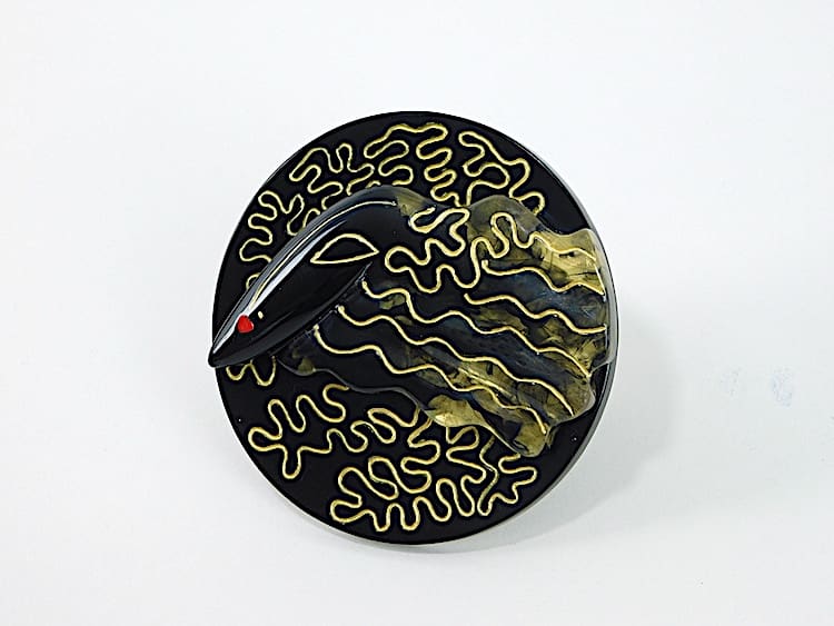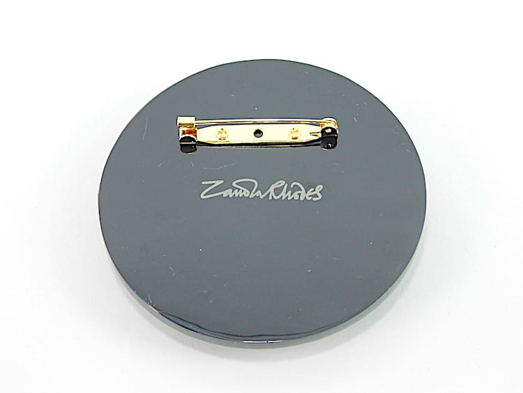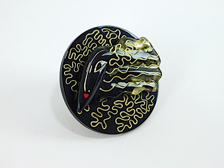 Black and gold hand painted phenolic art deco famous Manhattan head brooch. Signed to the back Zandra Rhodes. Comes in its original pink satin gift pouch.