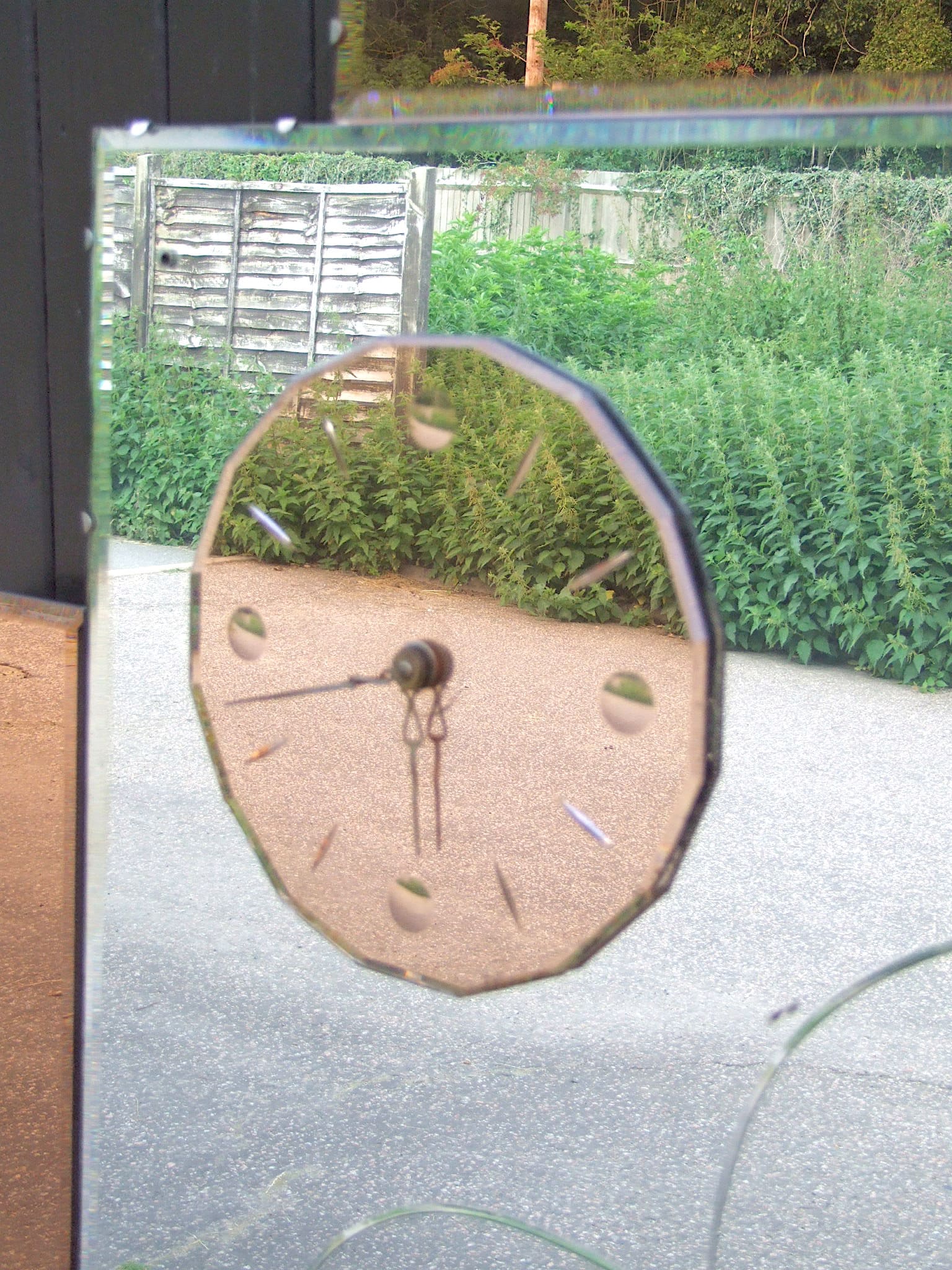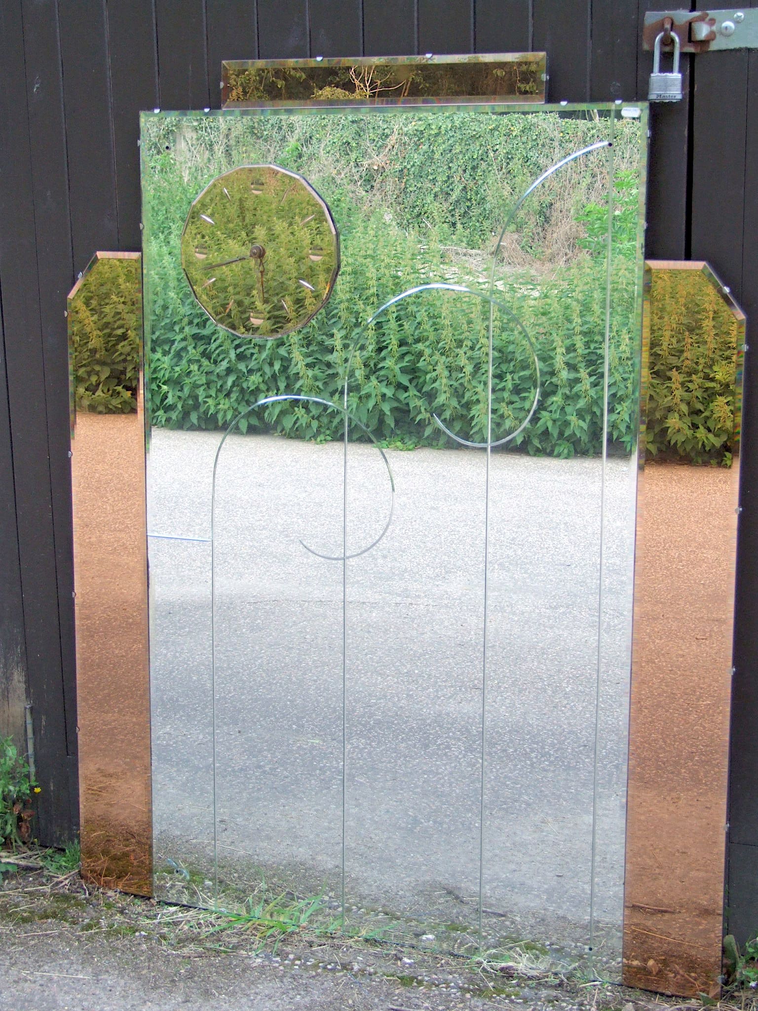 English peach and clear glass mirror with a central panel with deco motif etching, flanked by peach glass panels either side and along the top. A peach glass clock is mounted to the top left hand corner. Unsure if the electric clock is working as there is no plug