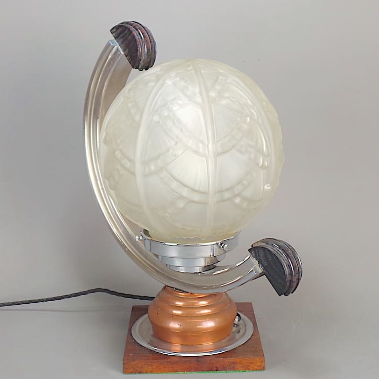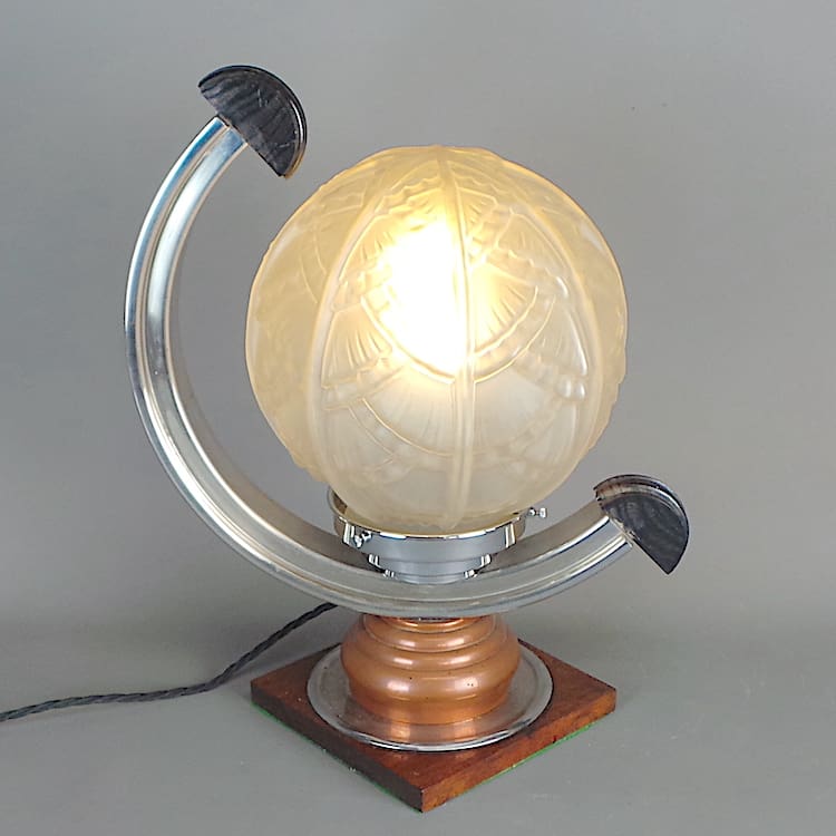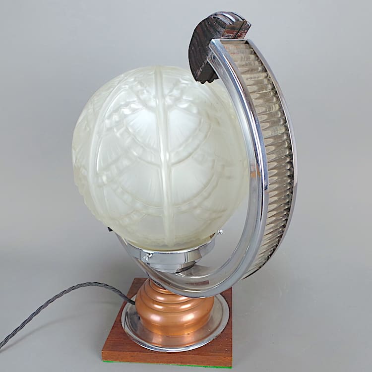 French table lamp with frosted glass globe, chromed arch with glass ribbed rods detail insert.