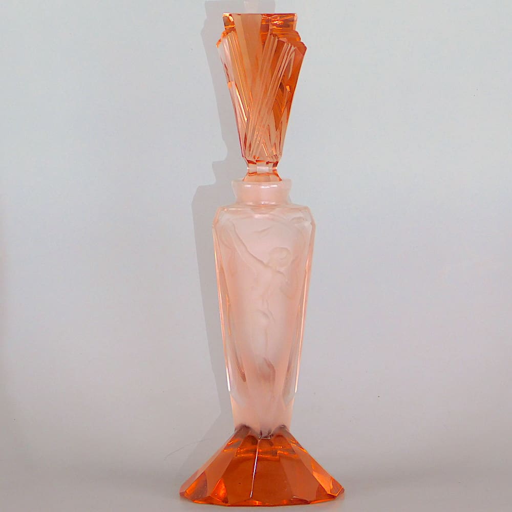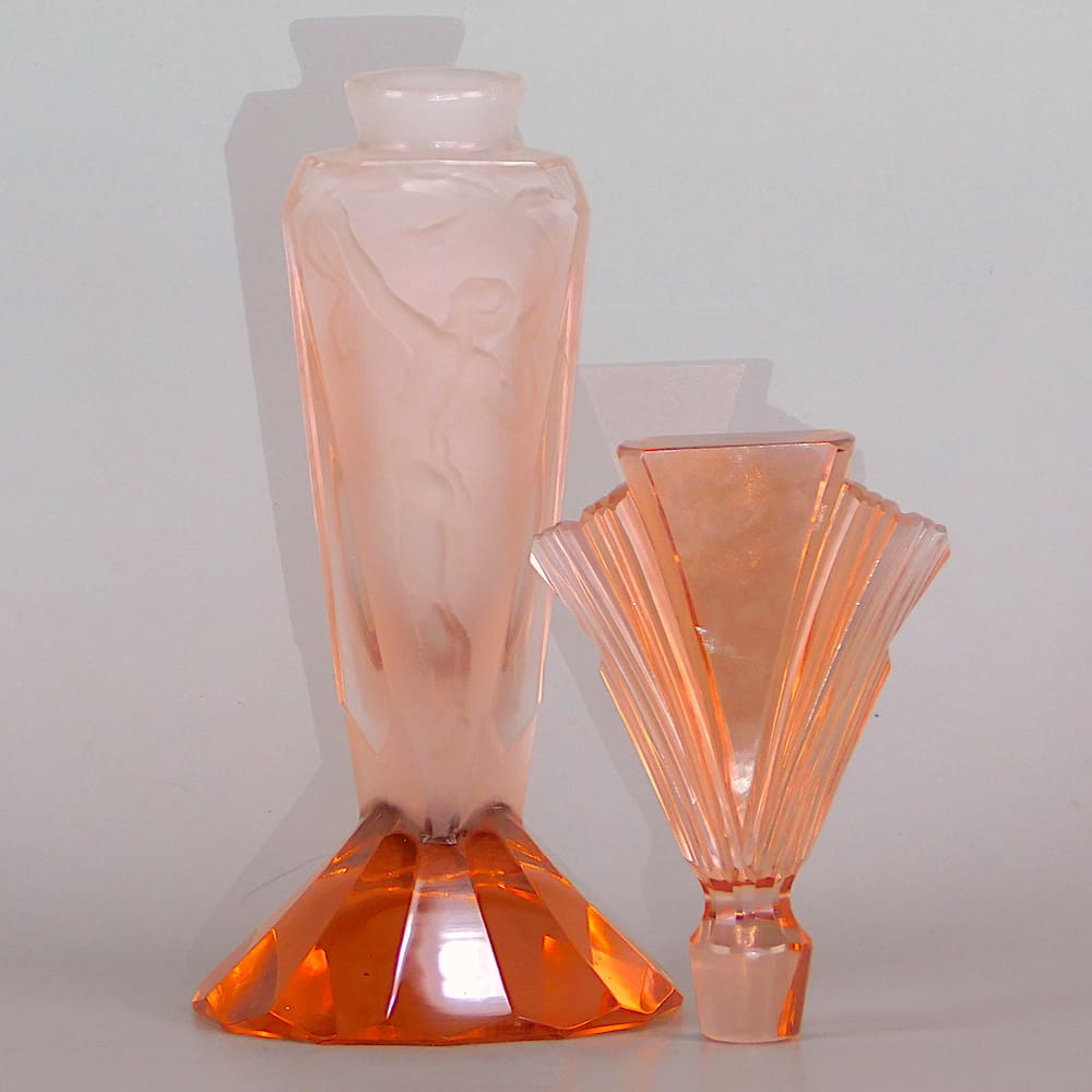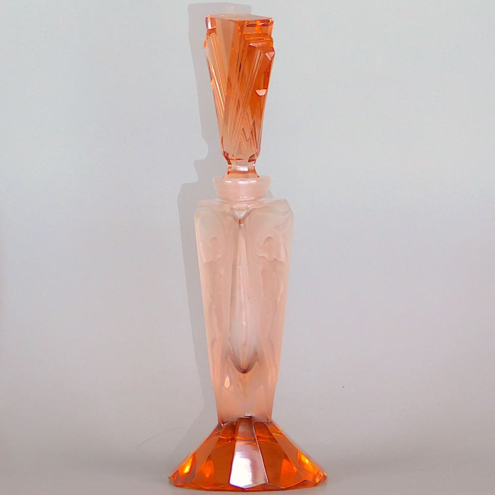 Czechoslovakian peach glass art deco scent bottle by Schlevogt.