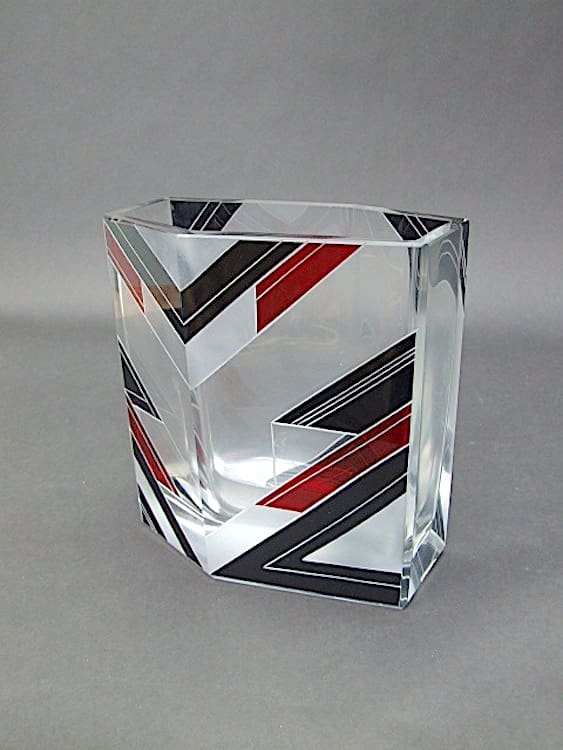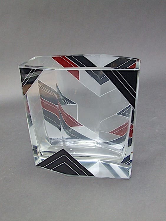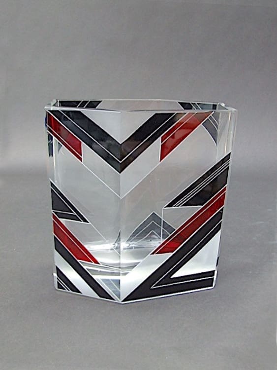 Chunky and very heavy glass vase with burgundy and black enamelling detail.