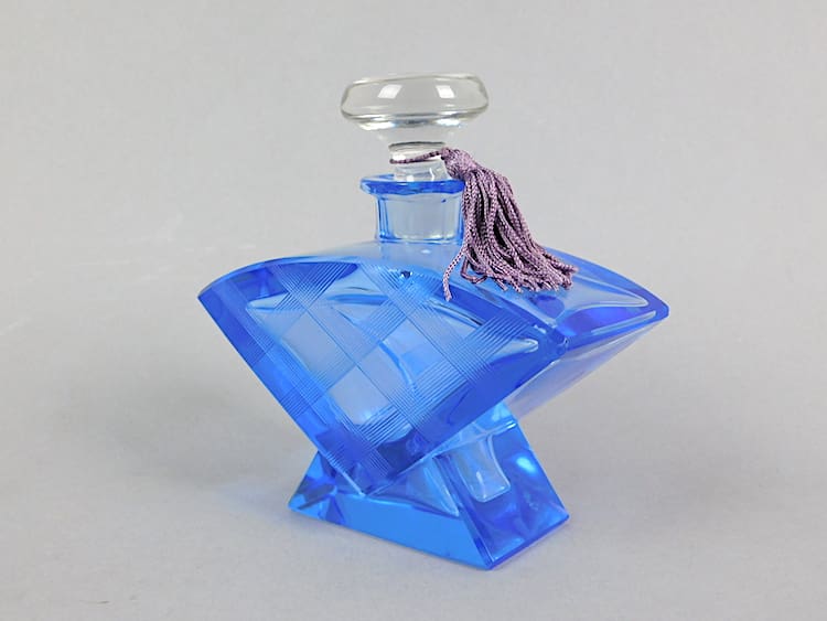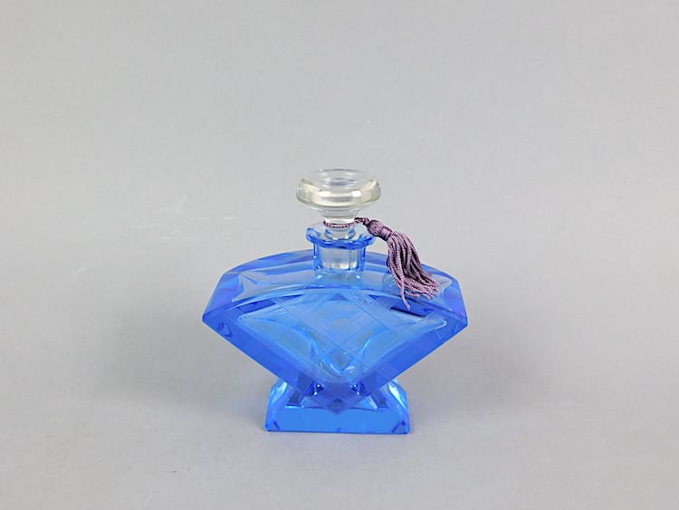 Large French blue glass pyramid acid etched art deco scent bottle.
