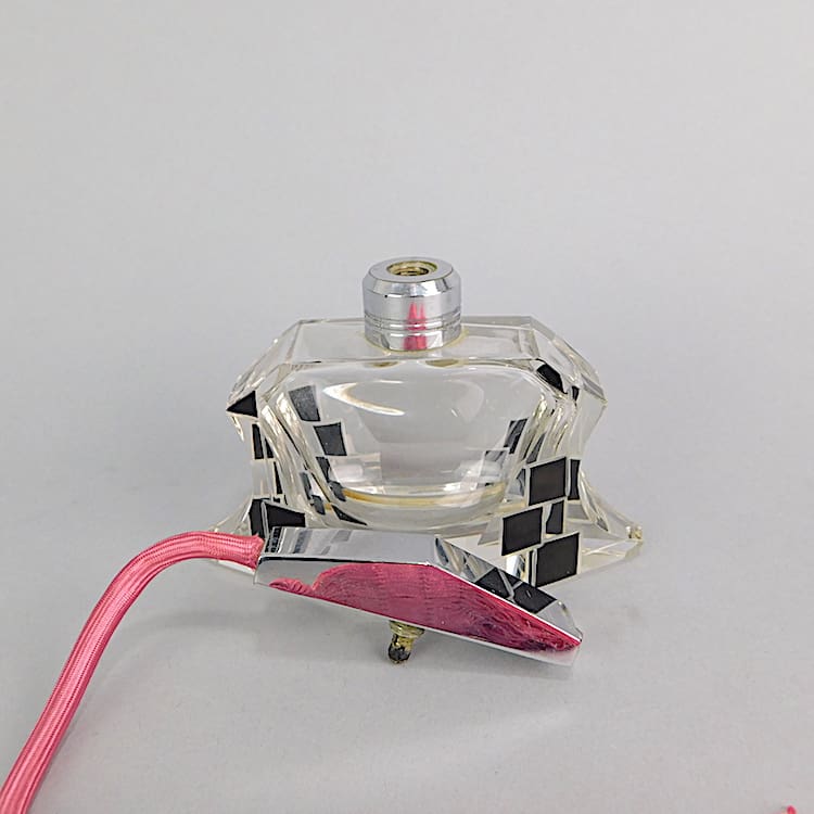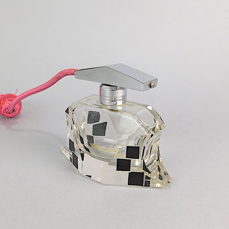 Large art deco glass and black enamel patterned scent bottle. An unsigned Karel Palda Czech item. Fitted with a silk covered puffer.
