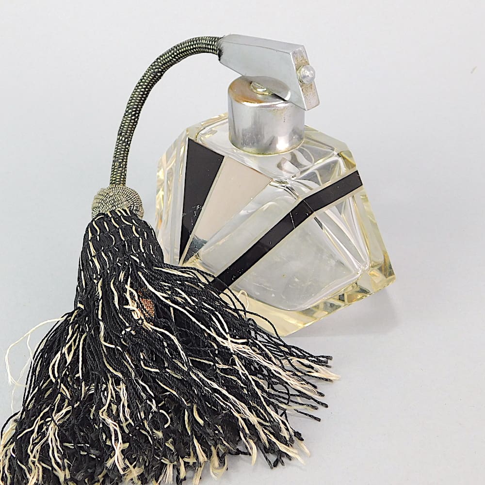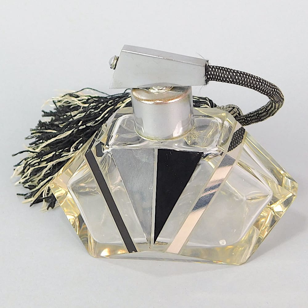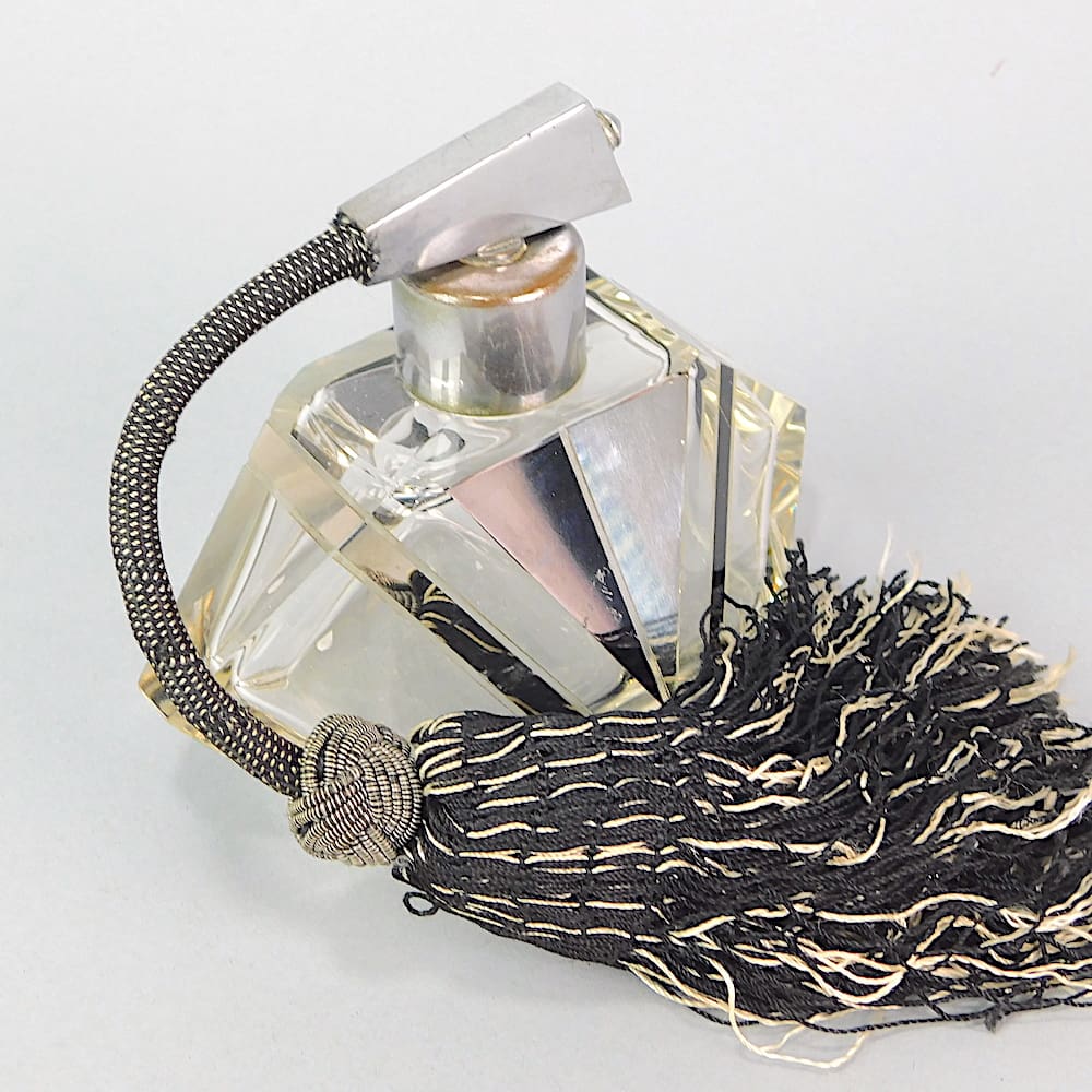 Czech leaded glass and black and silver enamel scent atomiser bottle. Unsigned but probably by Karel Palda.