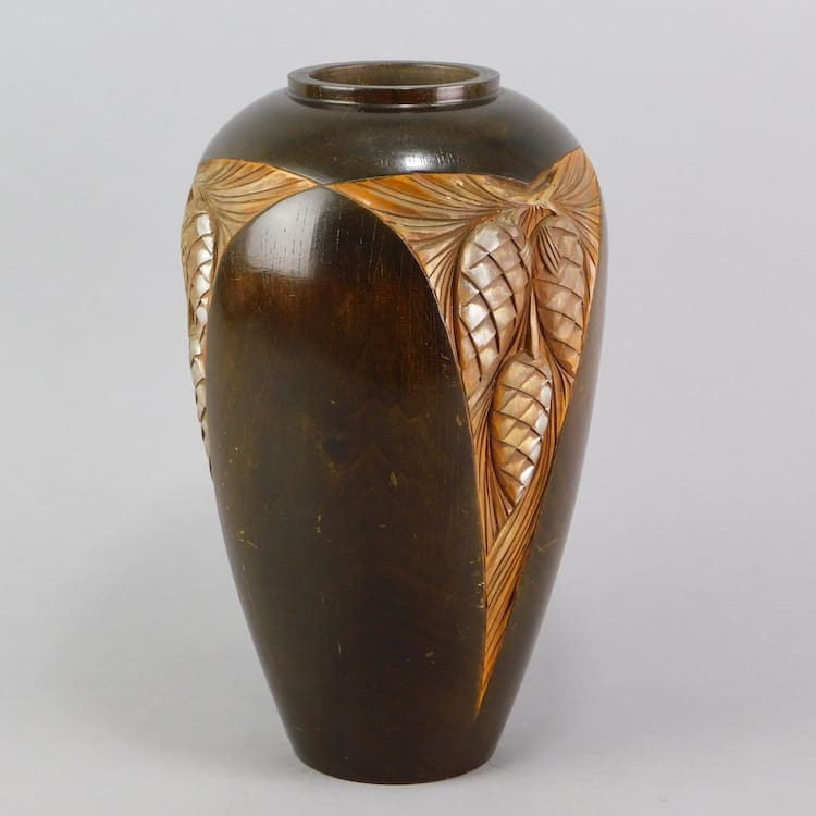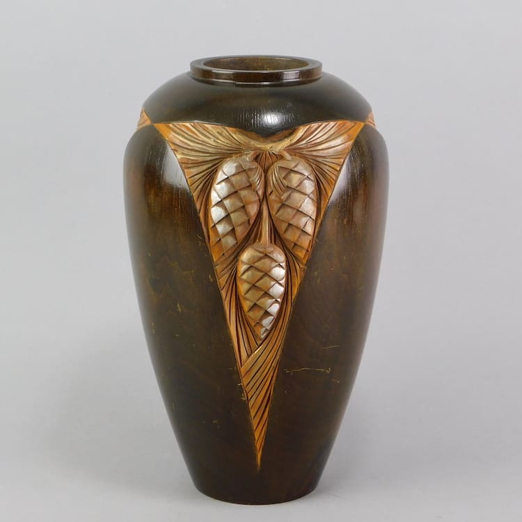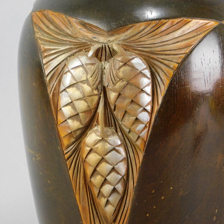 A French hand carved solid wood vase of baluster form with carved pine cones pattern