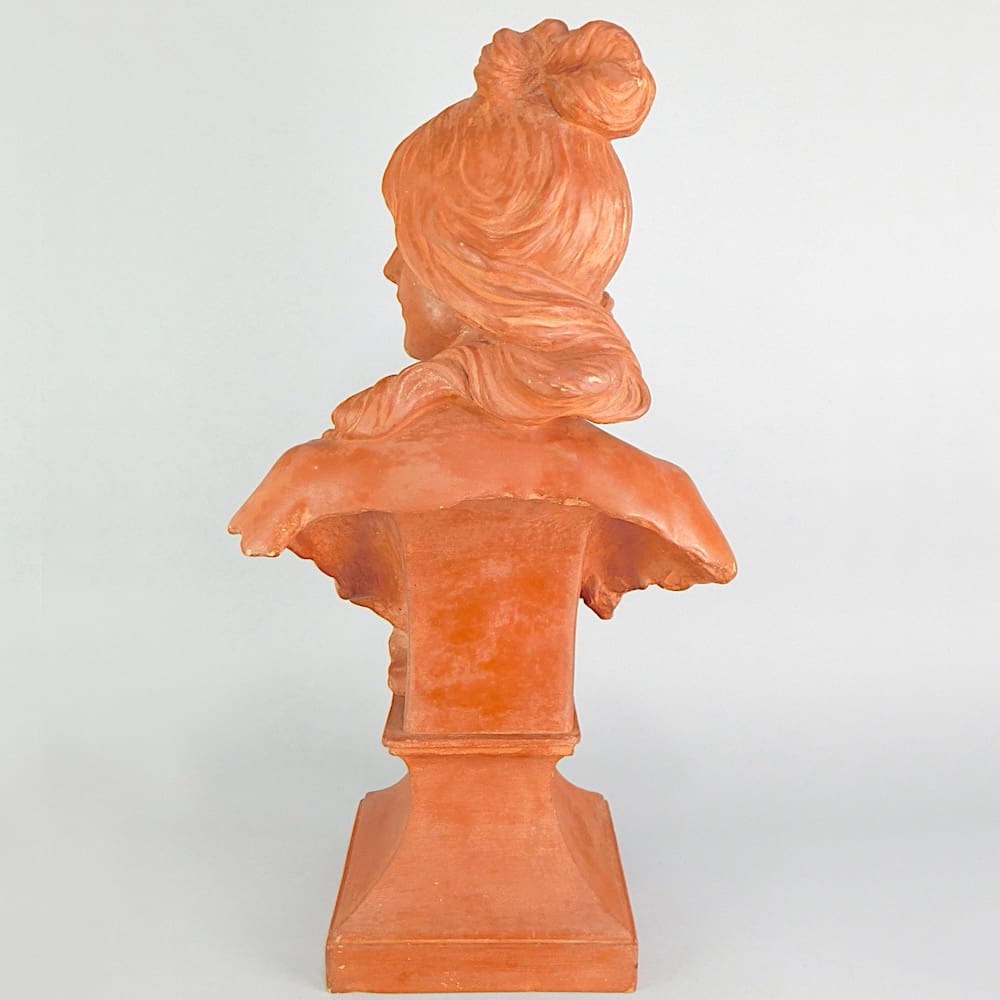 Large art nouveau terracotta bust of a young lady with a lovely face and long flowing hair signed ‘A. Nelson’.