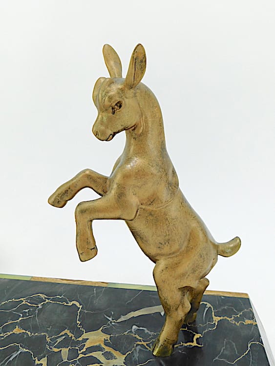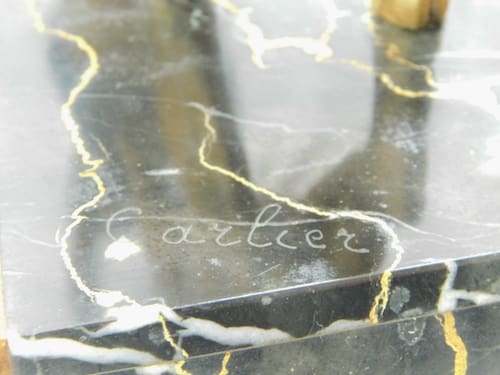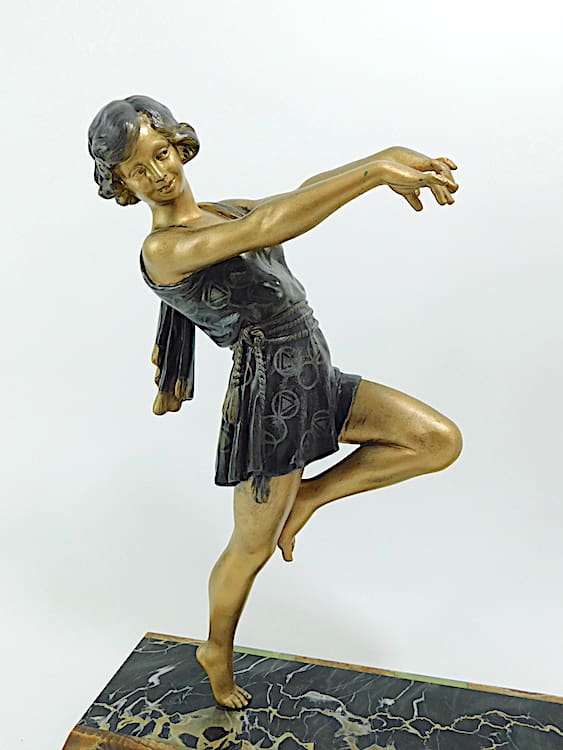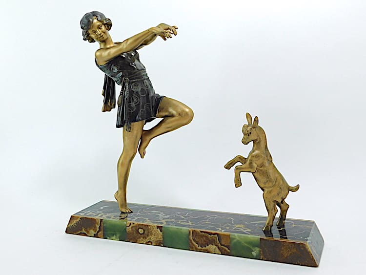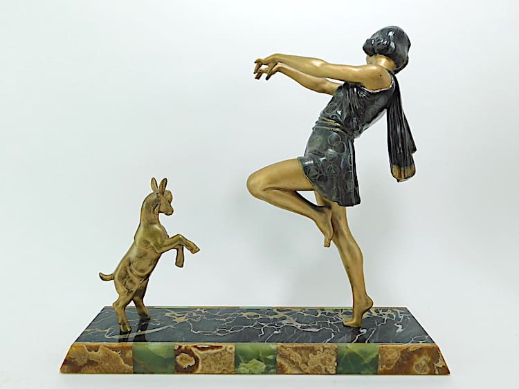 French spelter Toga Dancer (similar to the Godard Bubble Dancer, and modelled on the same theatrical dancer). This is the largest version of this model by Carlier and also incorporates the dancing goat. The base is of portorro extra with brown and green Brazilian onyx front panel. Signed to the base.