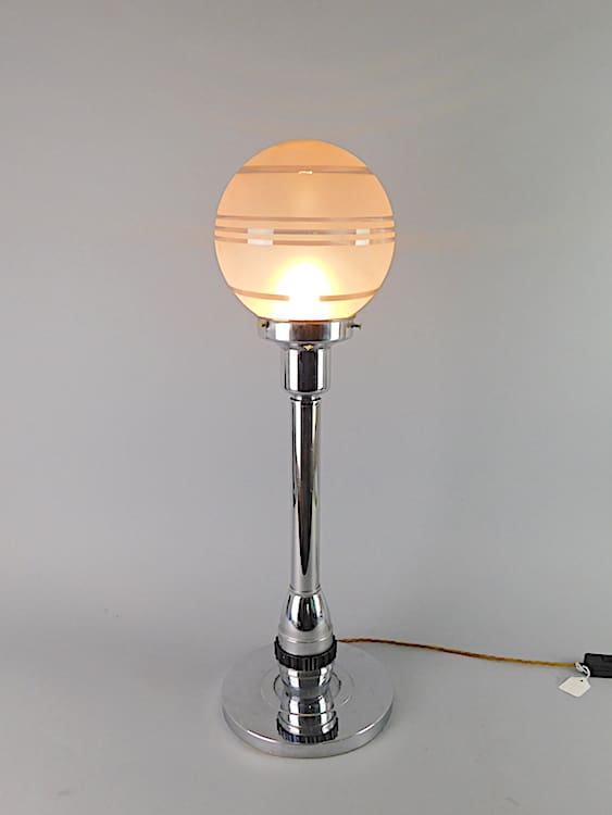 Large French chrome table lamp with ribbed phenolic base detail, know as the UFO lamp.