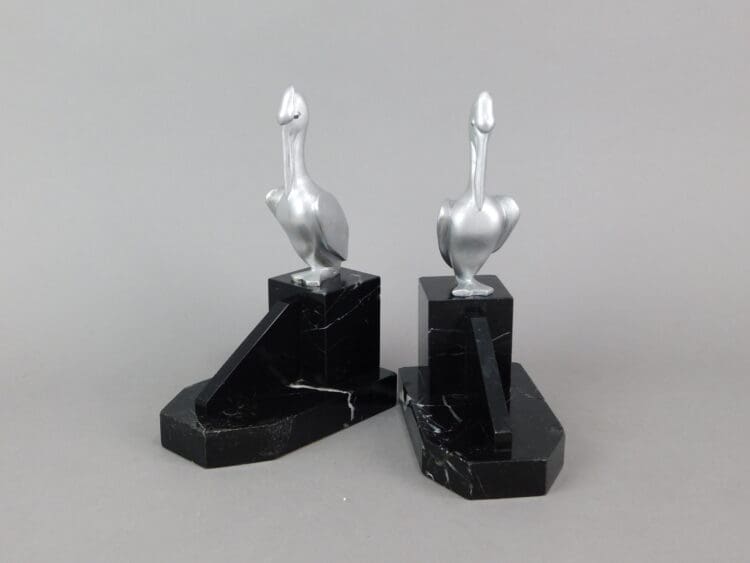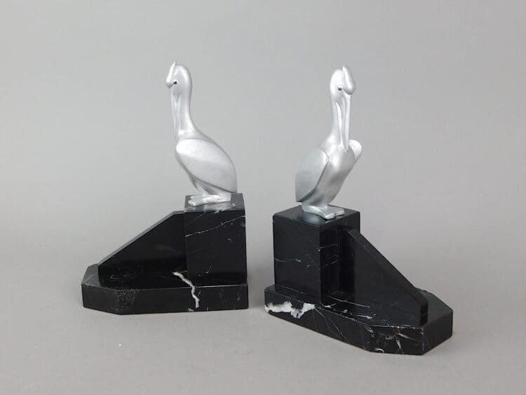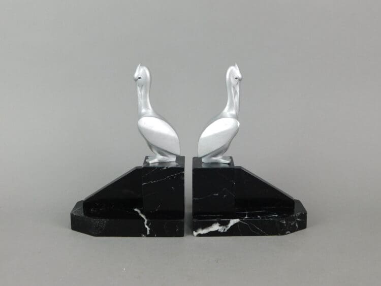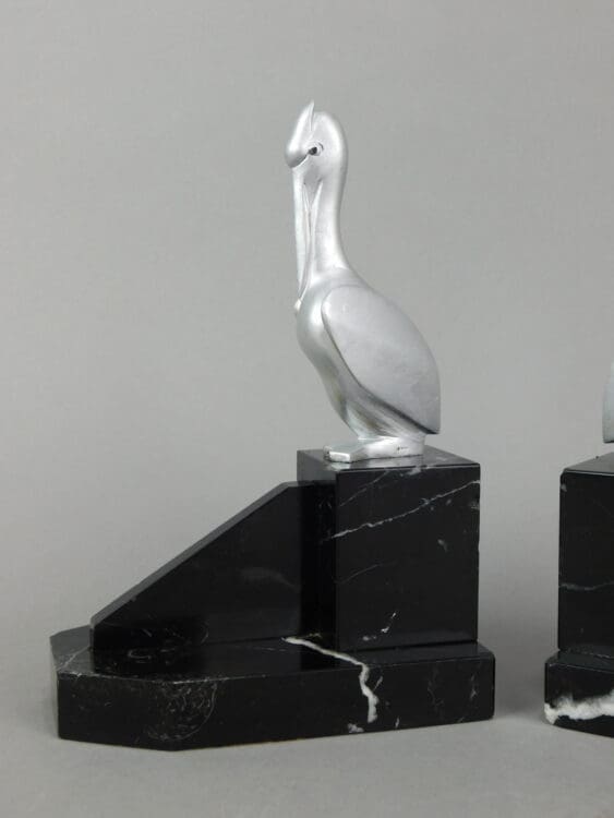 French art deco stylised bronze pelican bookends mounted on black marble bases. Signed to the base G. H. Laurent.