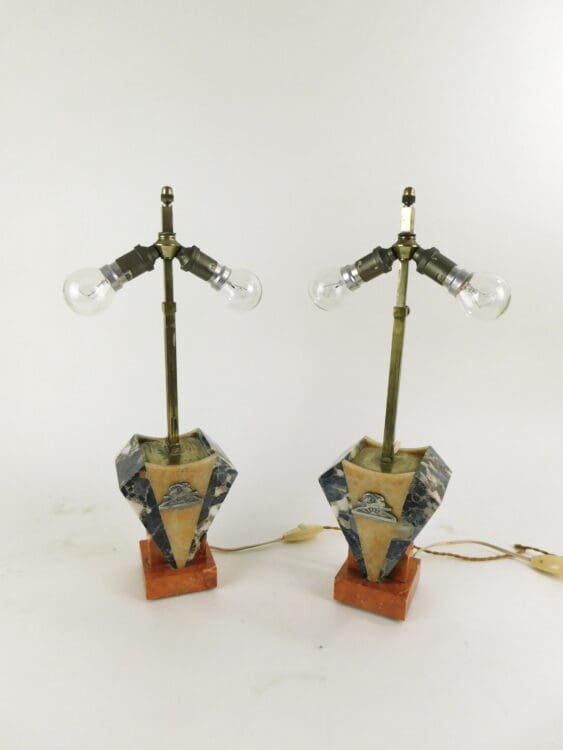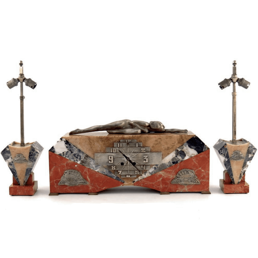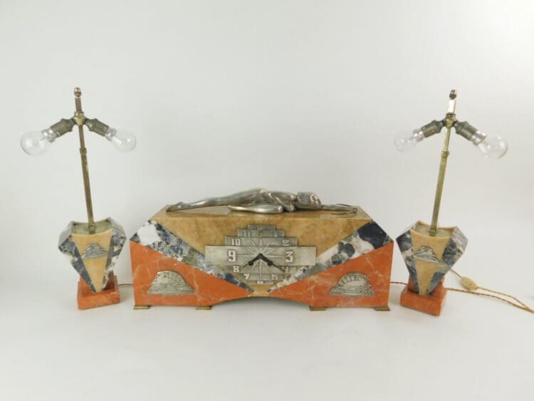 A signed Diane the Huntress clock set. The side pieces are extendable telescopic table lamps. The lamps have a double bulb holder to each but no shades.