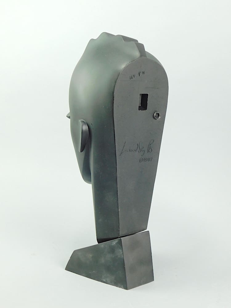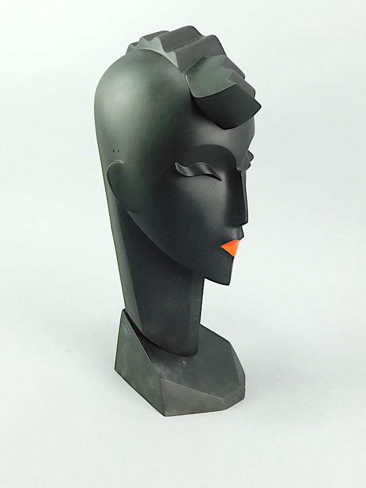 Black art deco neoplastic bust – her title is Waves. Signed and dated 1987 to the reverse.