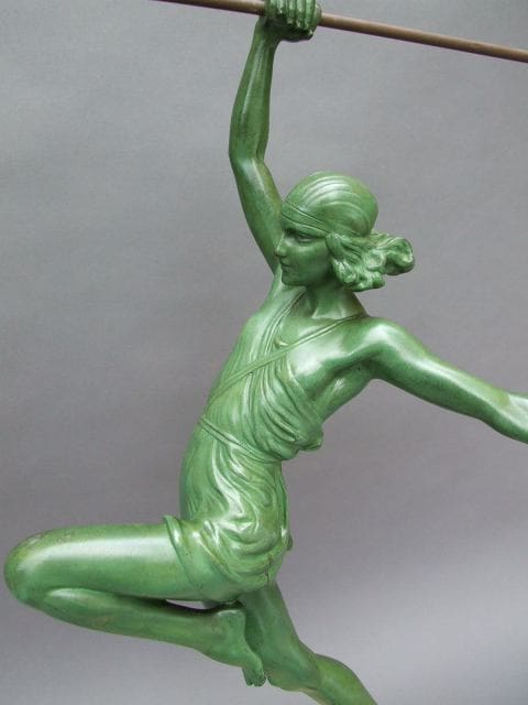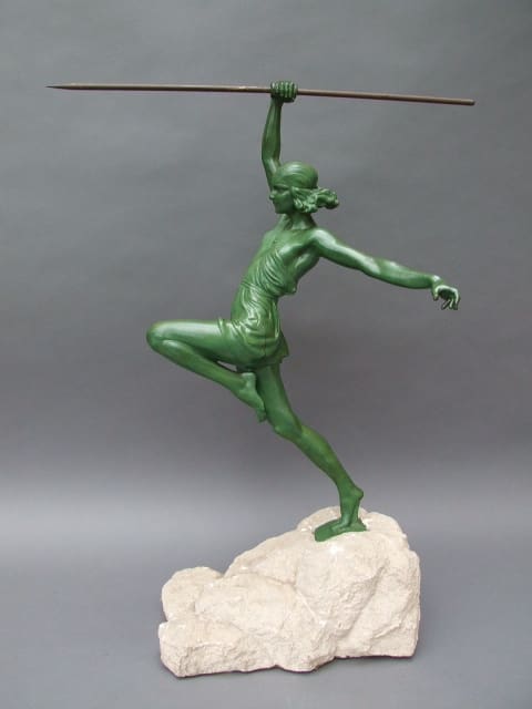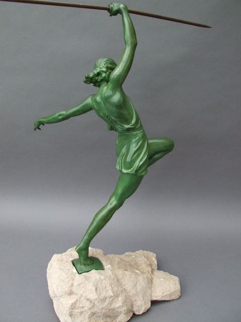 Dark green patinated Le Verrier art metal statue signed Le Faguays.
