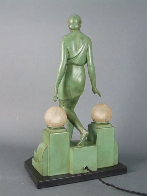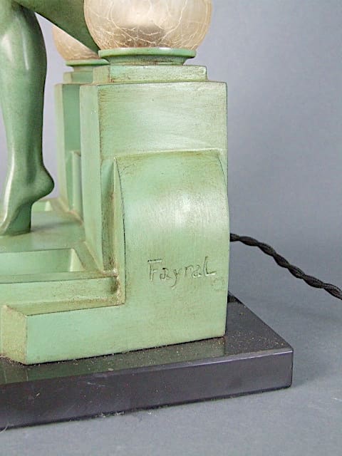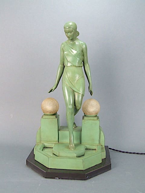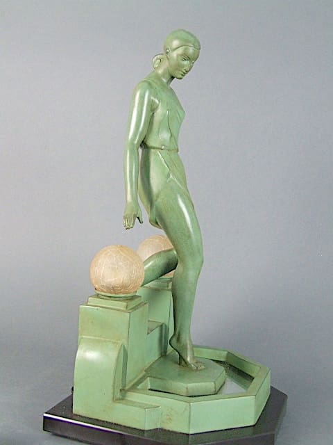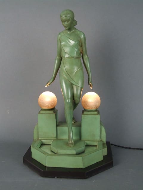 French lady lamp, made in the 1930s and signed Fayral (a pseudonym used by Pierre Le Faguays). The dark green patinated metal lady steps on the a lamp base with a mirrored pond detail and is flanked by two globe lamp shades.