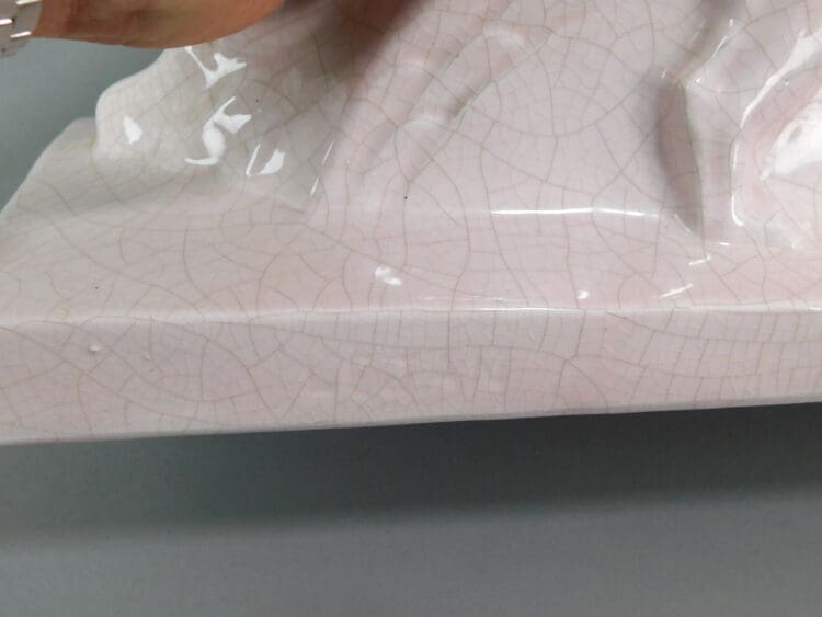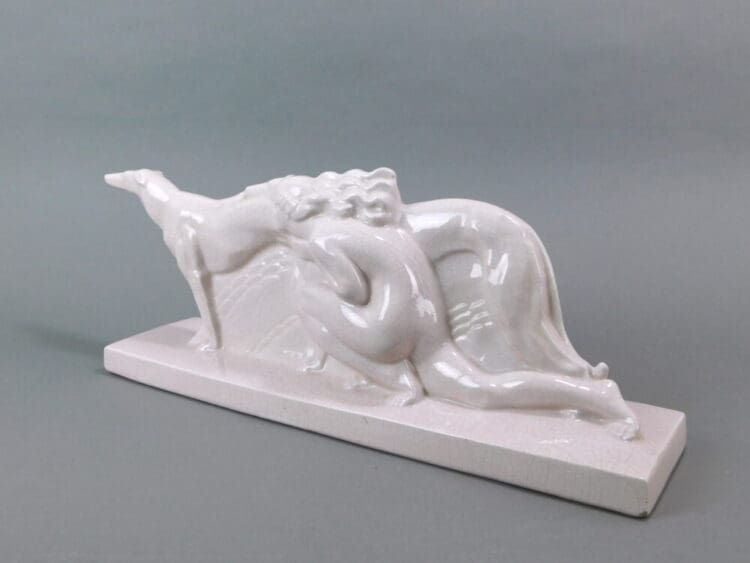 This is Nu Agenouille aux Levriers and was made by Orchies. A pink crackle glaze woman kneeling beside a pair of borzois. There is a signature – barely visible – Le Jan to the back of the base.