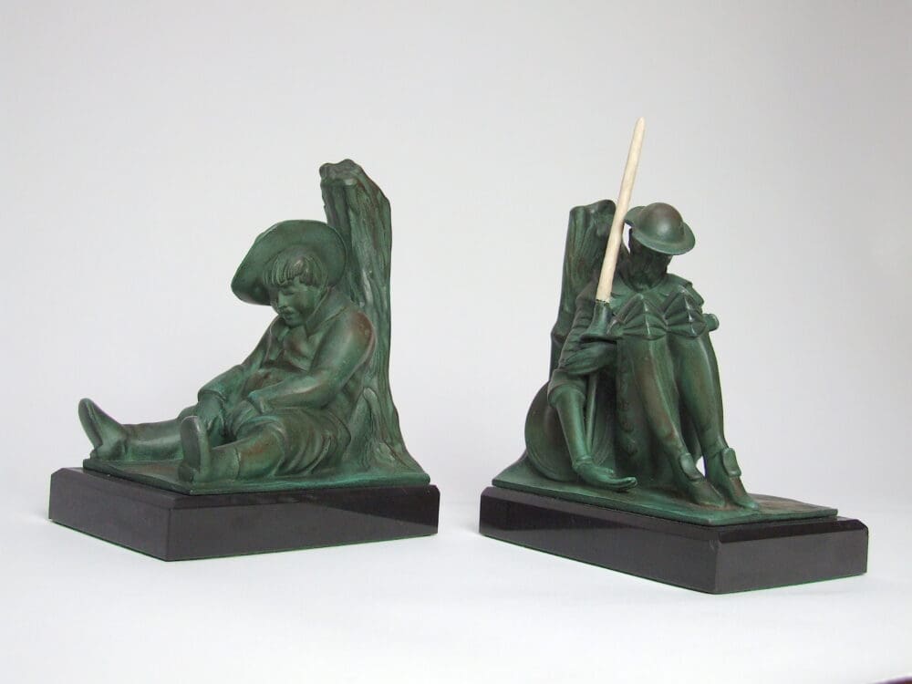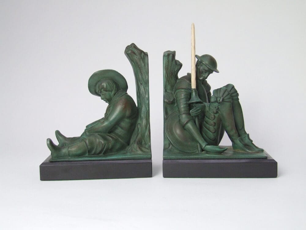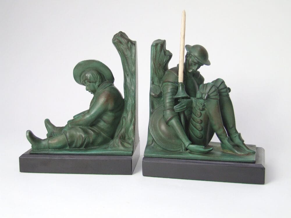 This comical pair of book ends are Don Quixote and his side kick Sancho Panza. They were designed and are signed by Janle and produced by the Le Verrier foundry. The lance is made of a celluloid material.