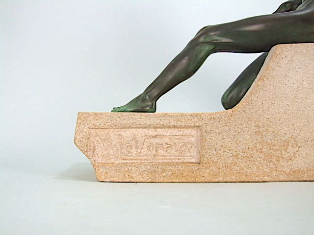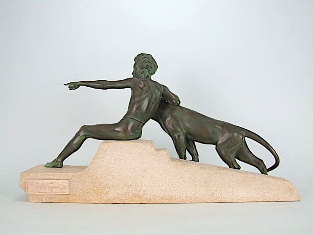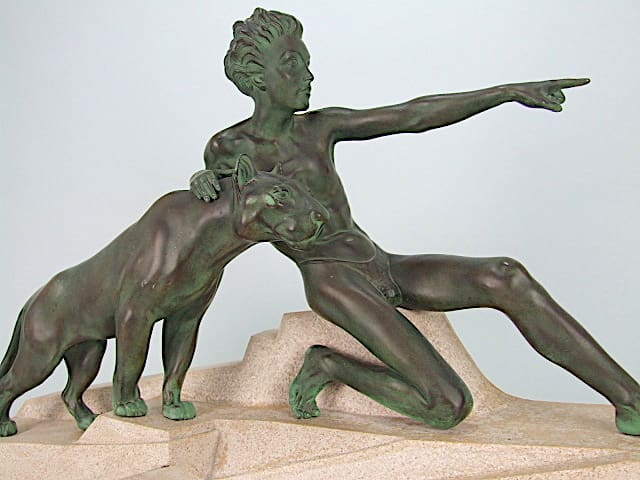A green patinated spelter boy and panther group mounted on a shaped stone base. Signed to the base Le Verrier and made in France in the 1930s.