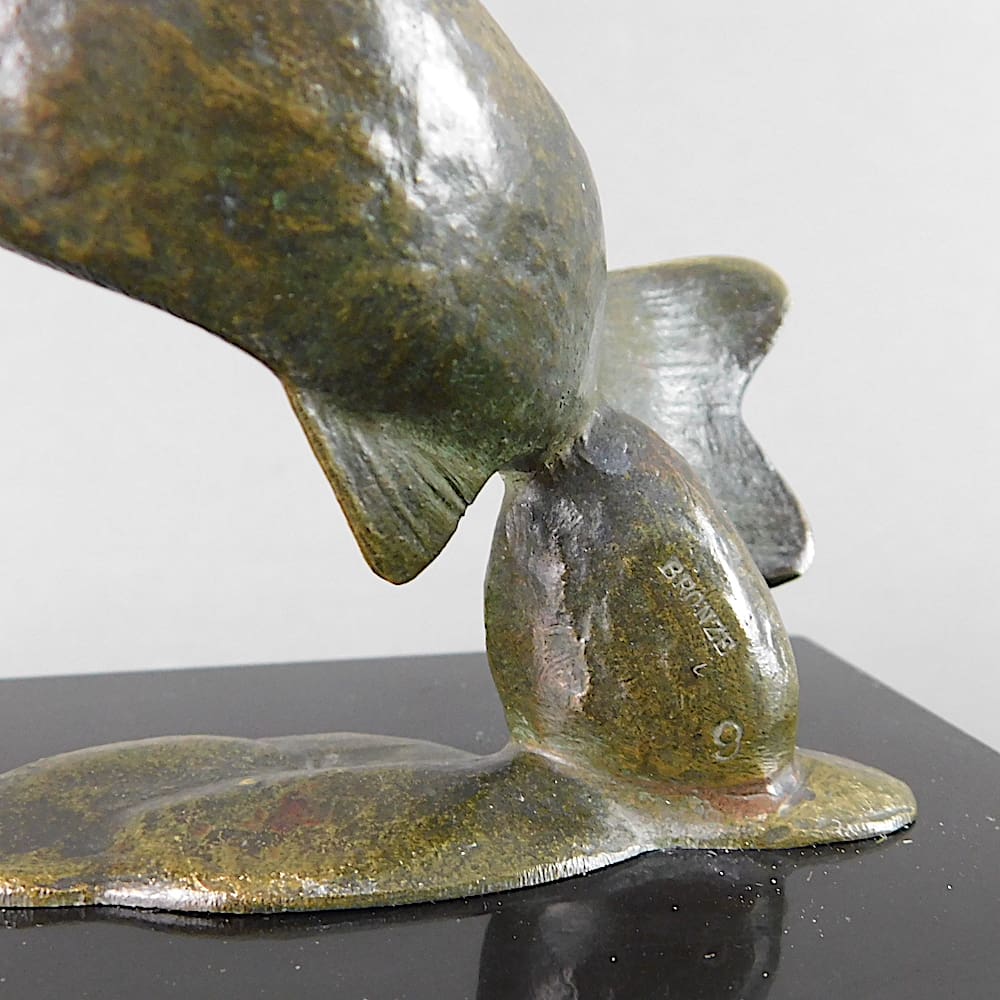 Rare French green patinated leaping trout statue.