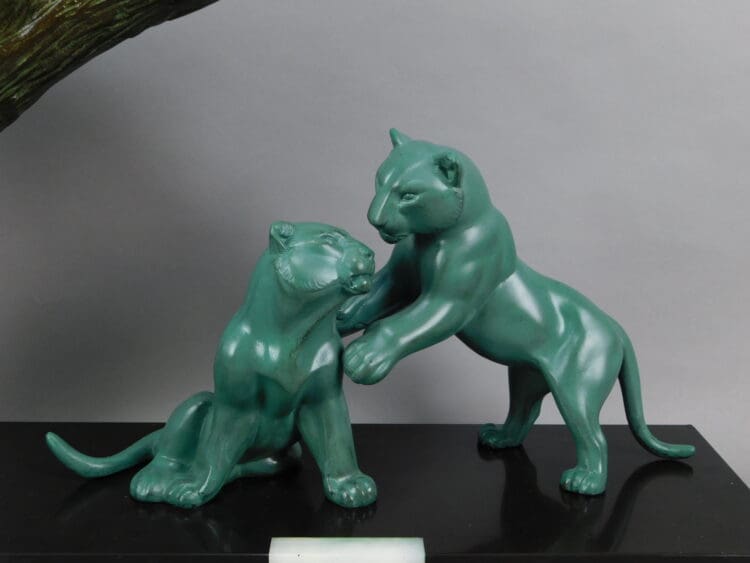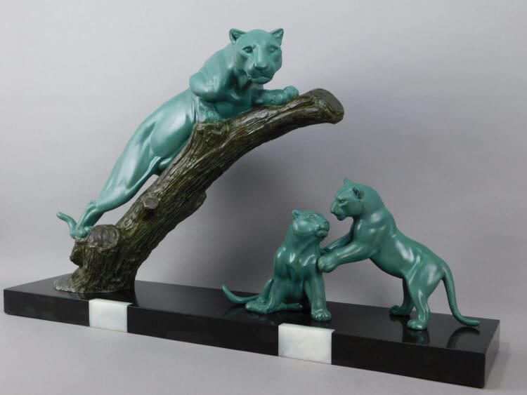A signed French art deco spelter figural panther family group. Mounted on a black marble and onyx base.