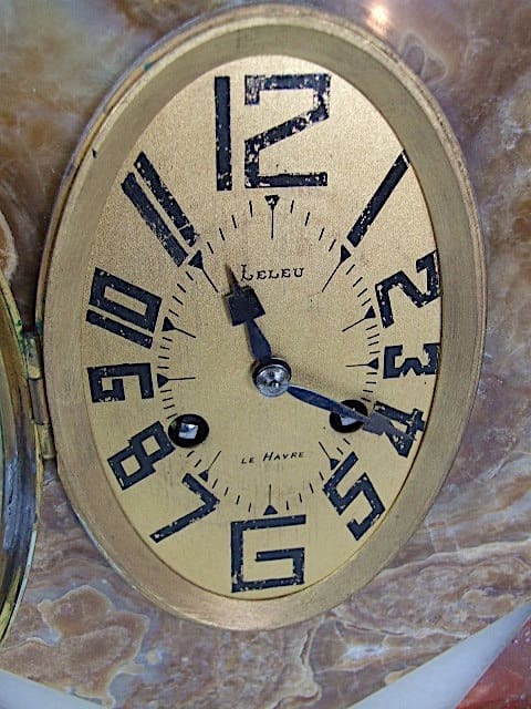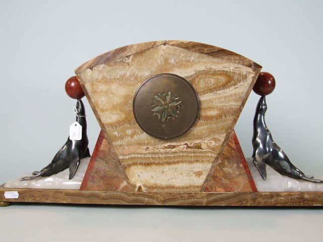 French silvered bronze seals clock. Casing made of onyx with white onyx under each seal to simulate icebergs. Comes with its original pendulum and key. The clock face is signed Leleu.